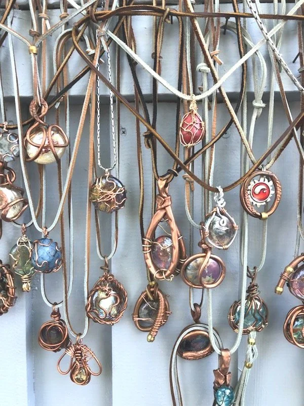 JGT’s jewelry is wearable art combining crystal painted glass stones with natural seashells and stones encased in artistically crafted copper or aluminum craft wire.