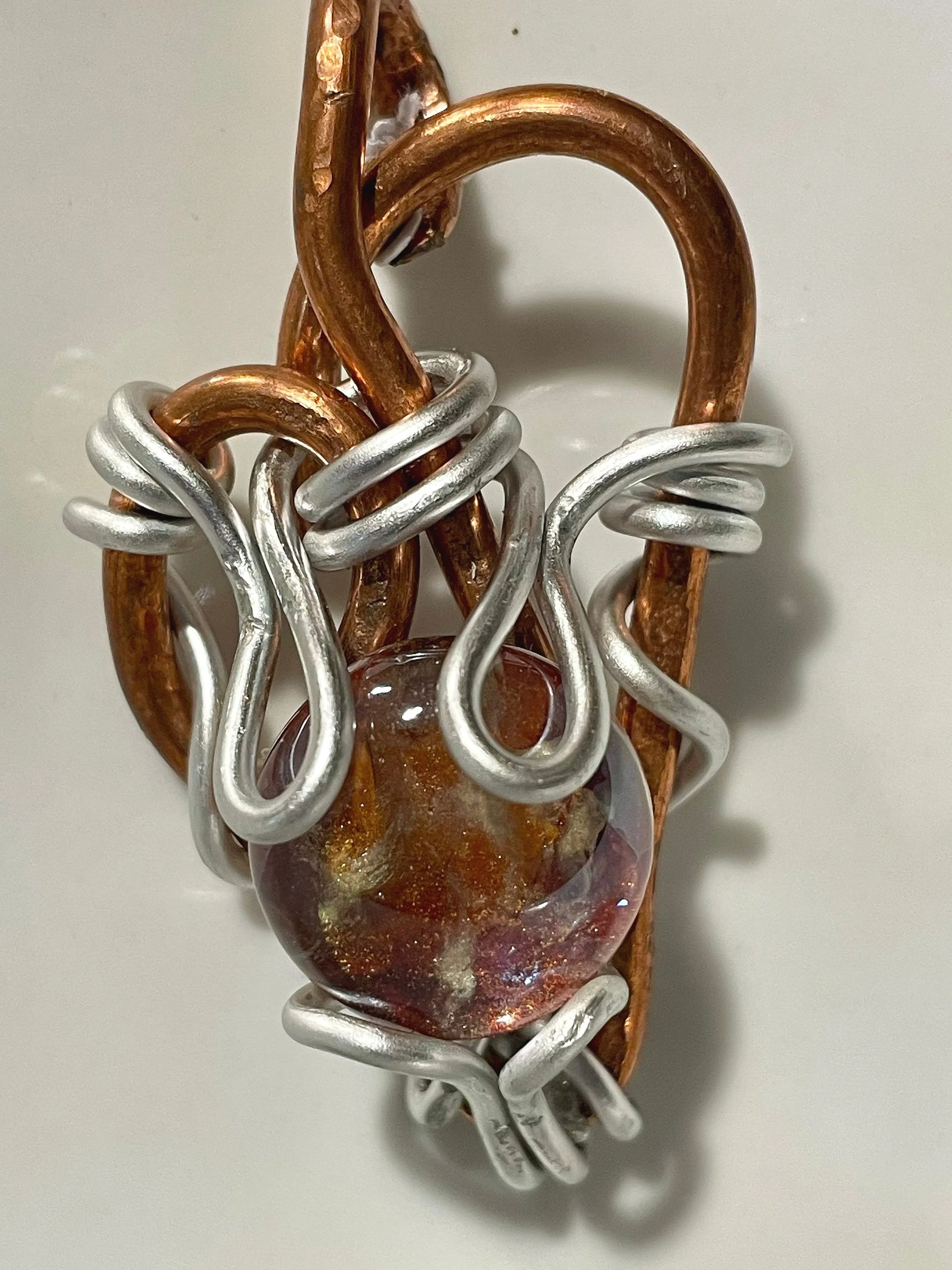 This pendant has strong undertones symbolic of spiritual healing, prosperity, and endurance. Copper and aluminum wire is delicately wrapped into a heart shape and surrounds a painted glass stone with shimmering hues of gold, beige and red.