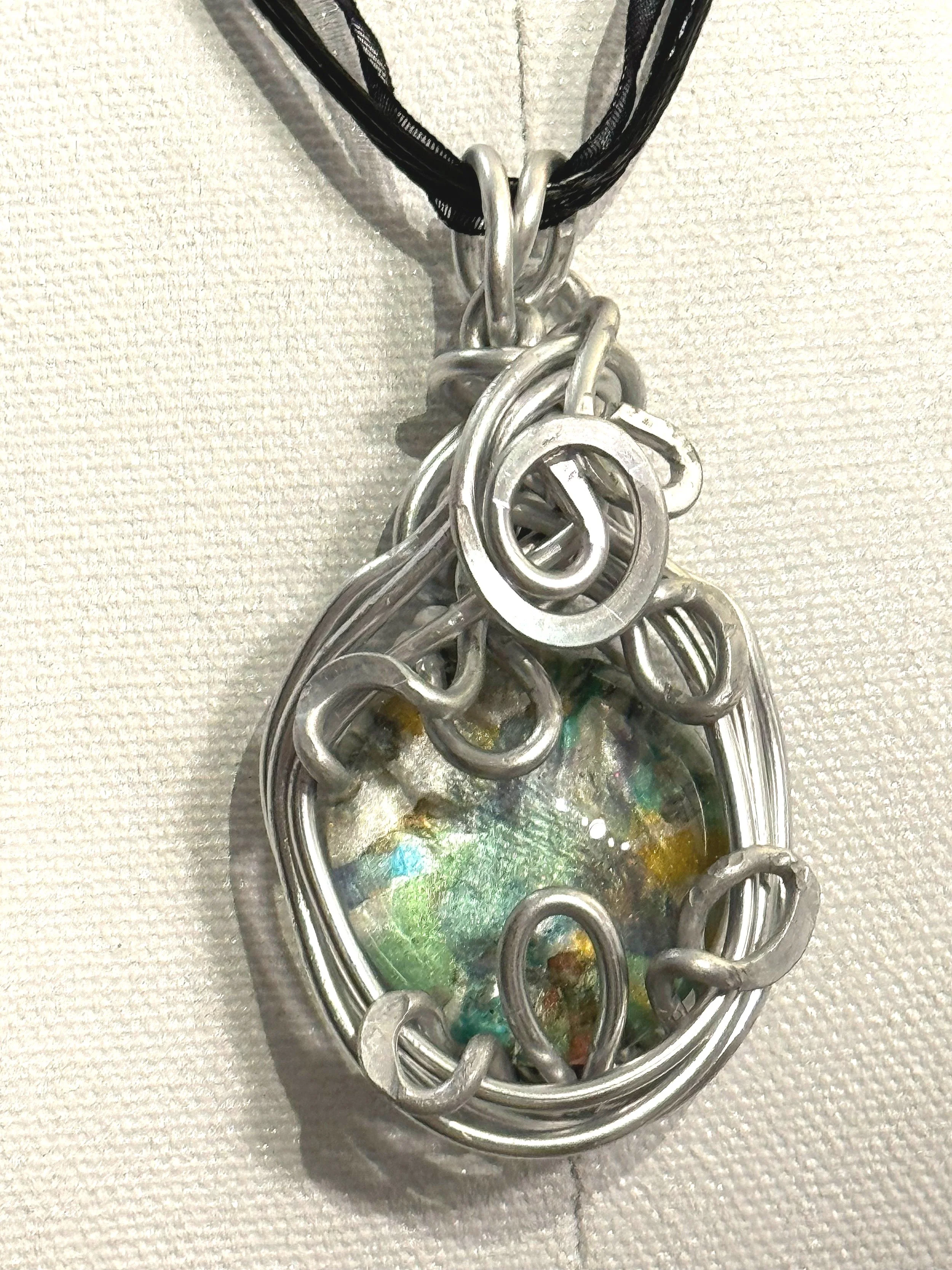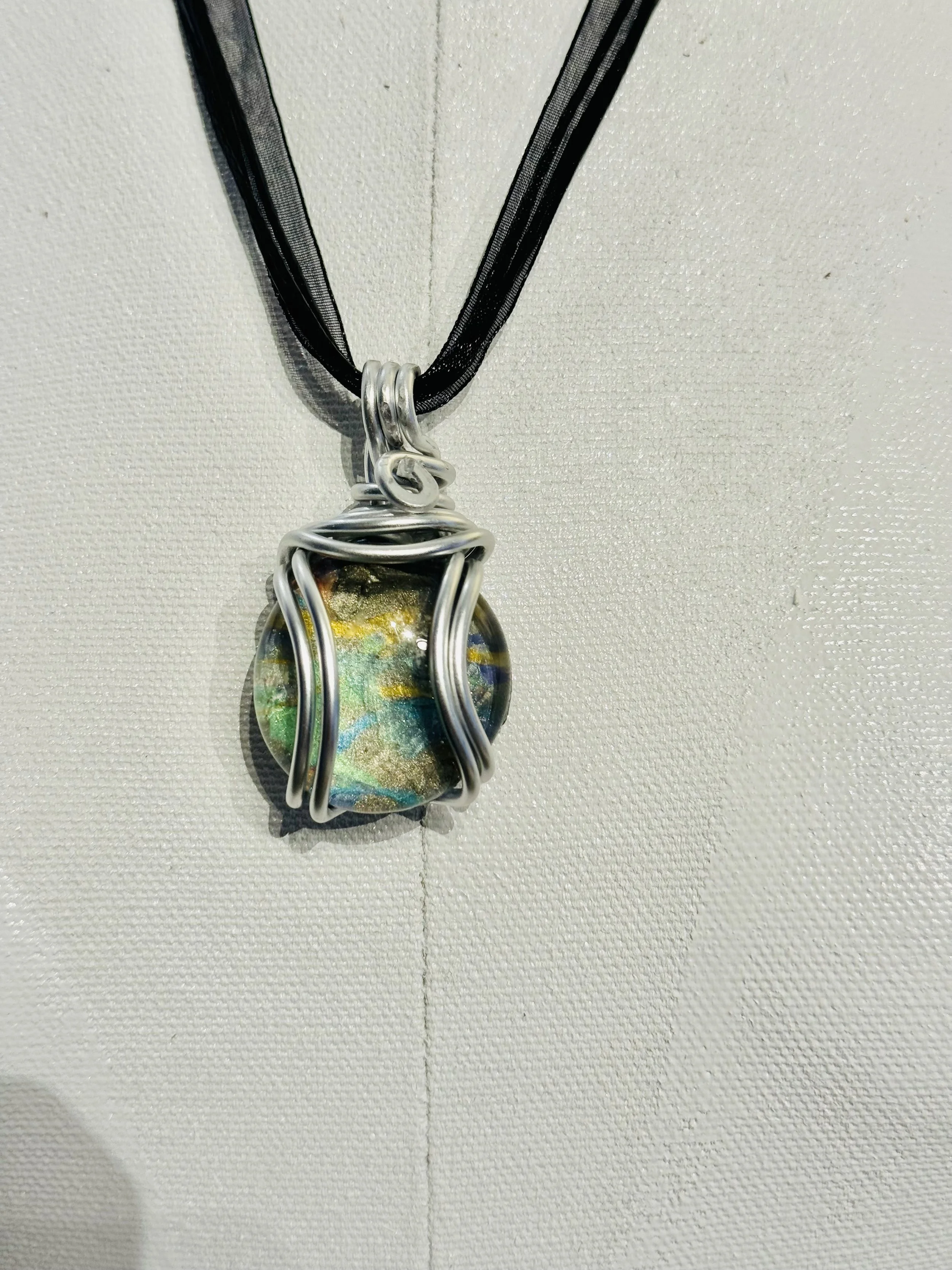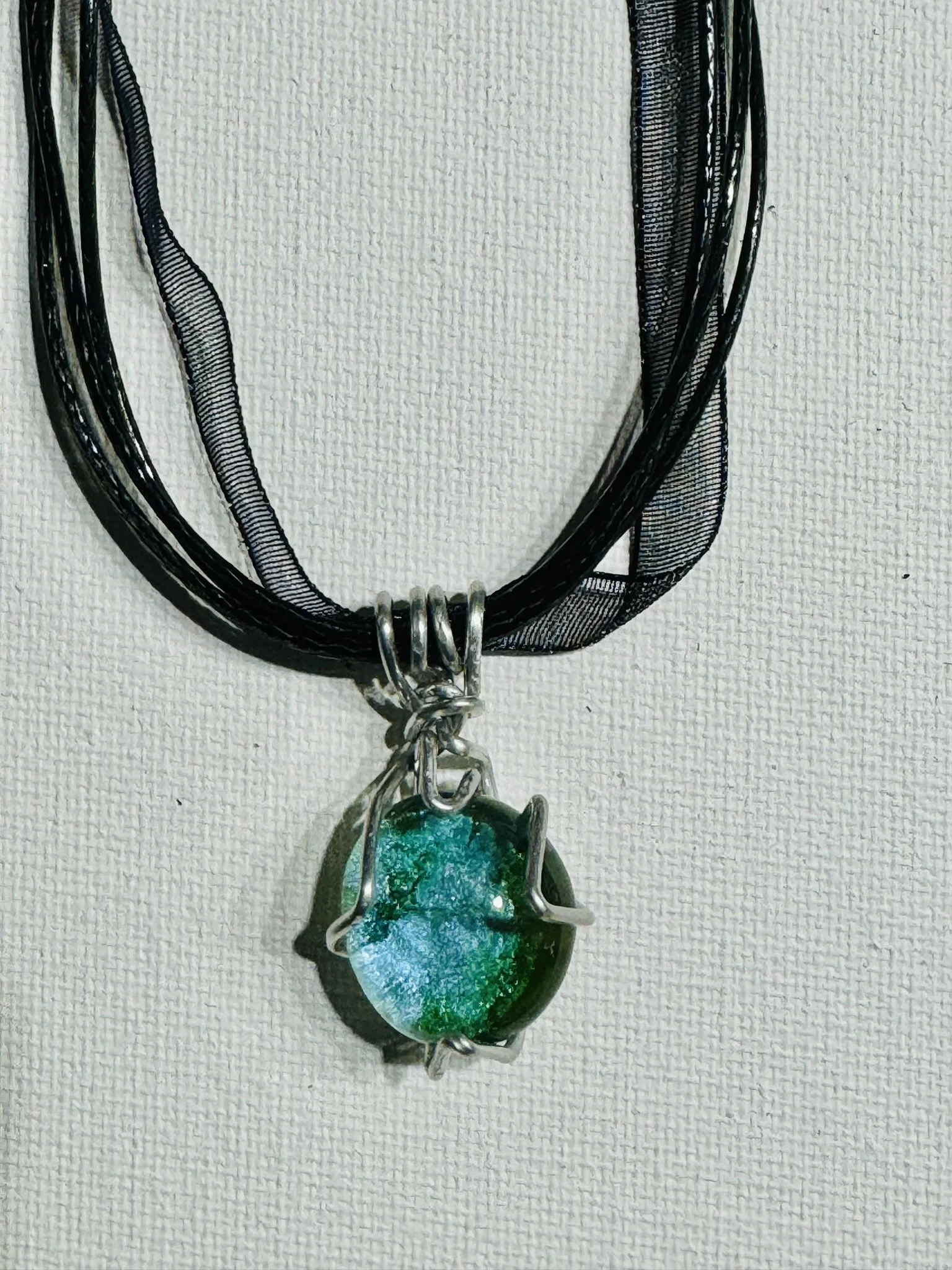 W#81: Crystal painted glass stone with aluminum craft wire. Approximate stone dimensions: 3 cm (about 1.18 in) in diameter. Includes a black 17'' layered multi-strand voile organza ribbon necklace cord or an 18” white waxed necklace string rope cord (2mm dia) with chain clasp.