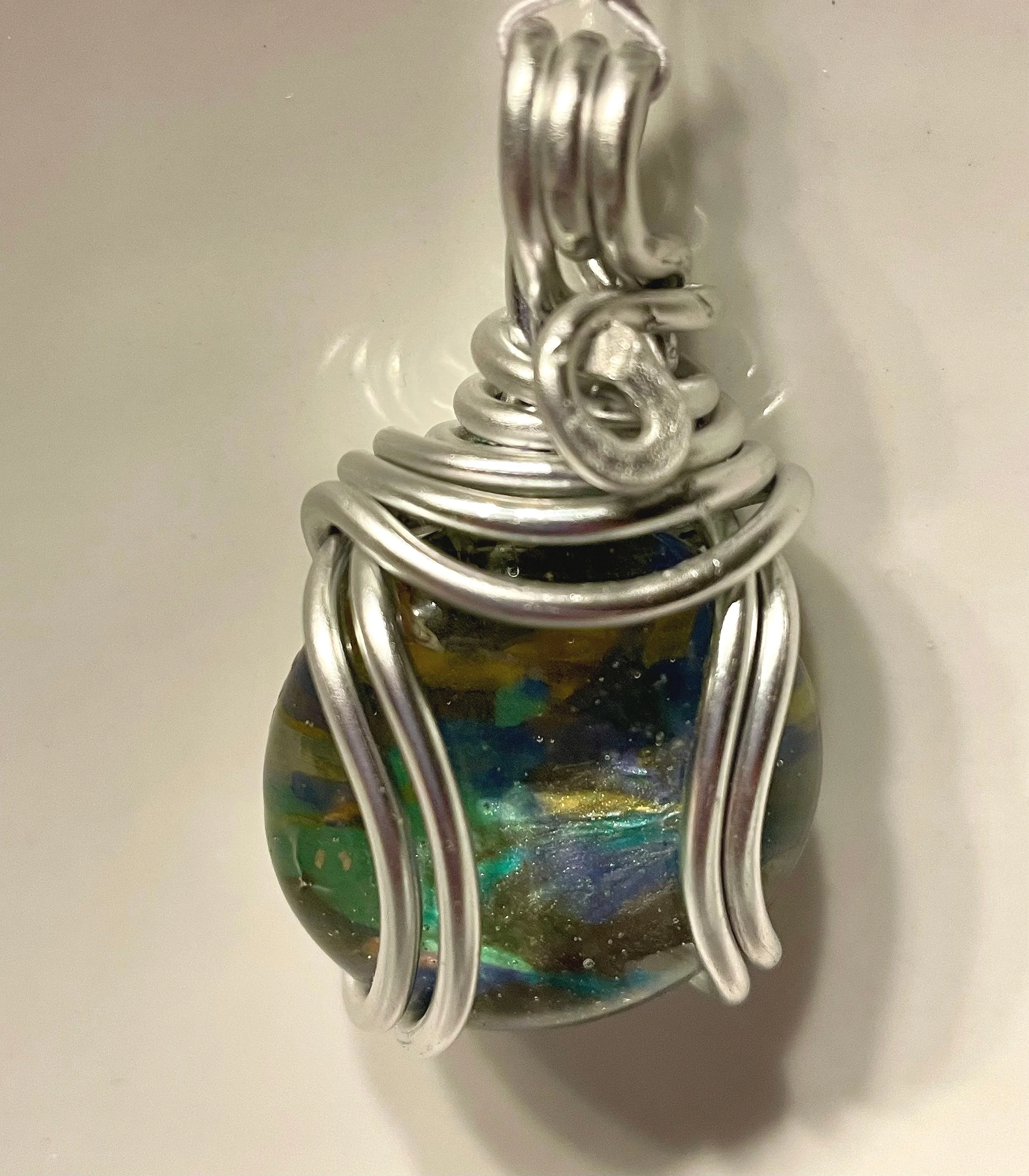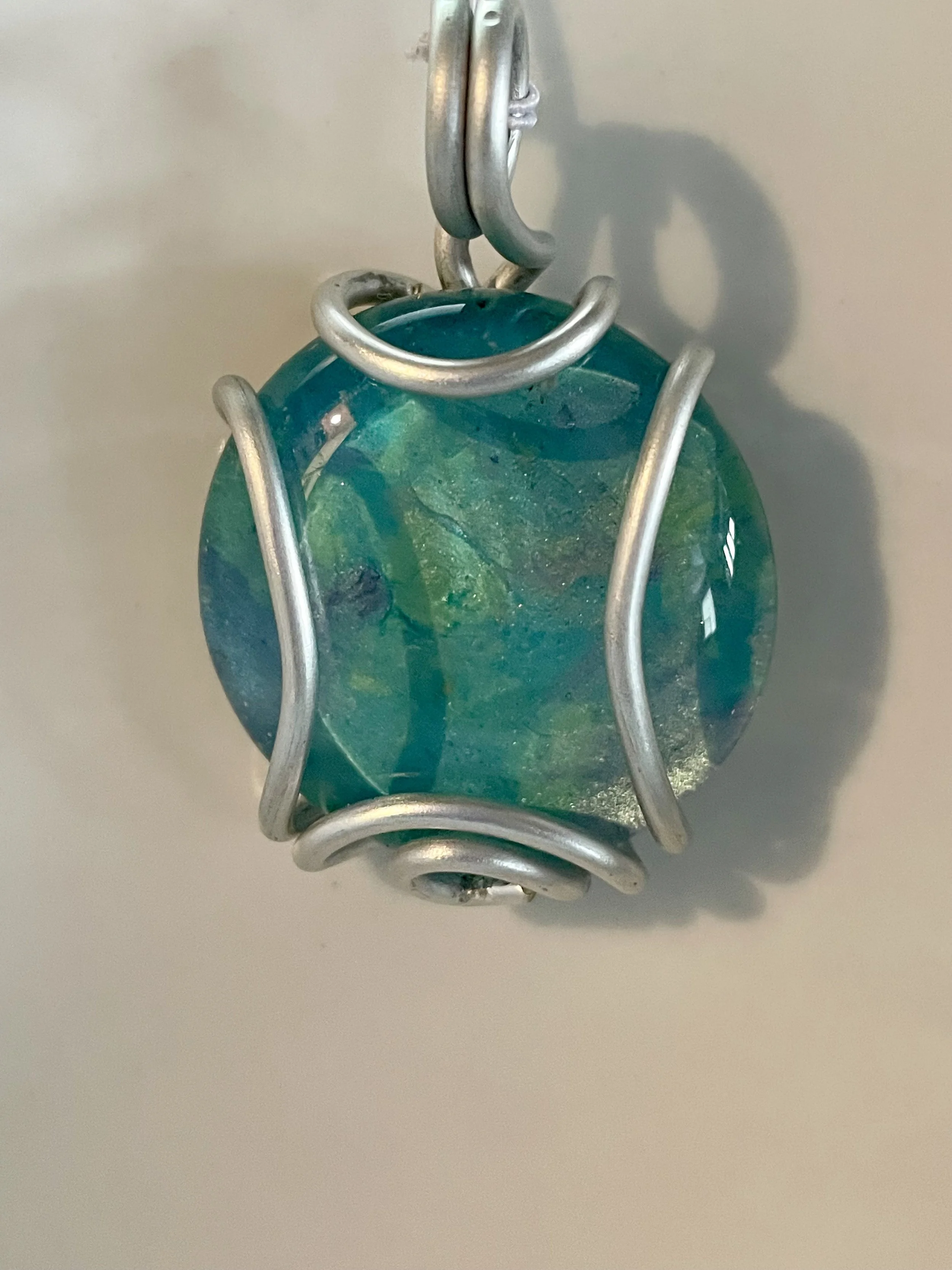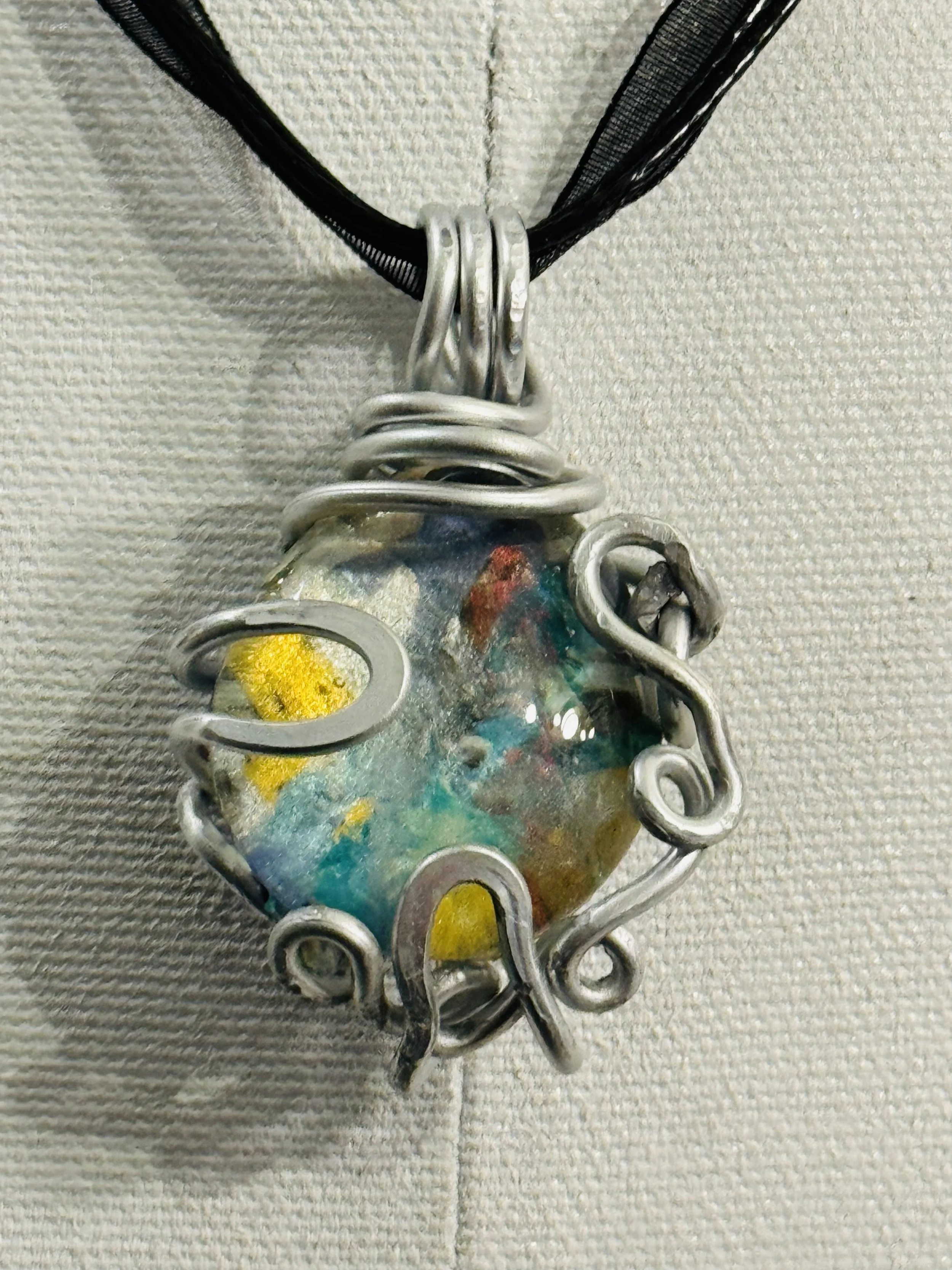 W#81: Crystal painted glass stone with aluminum craft wire. Approximate stone dimensions: 3 cm (about 1.18 in) in diameter. Includes a black 17'' layered multi-strand voile organza ribbon necklace cord or an 18” white waxed necklace string rope cord (2mm dia) with chain clasp.