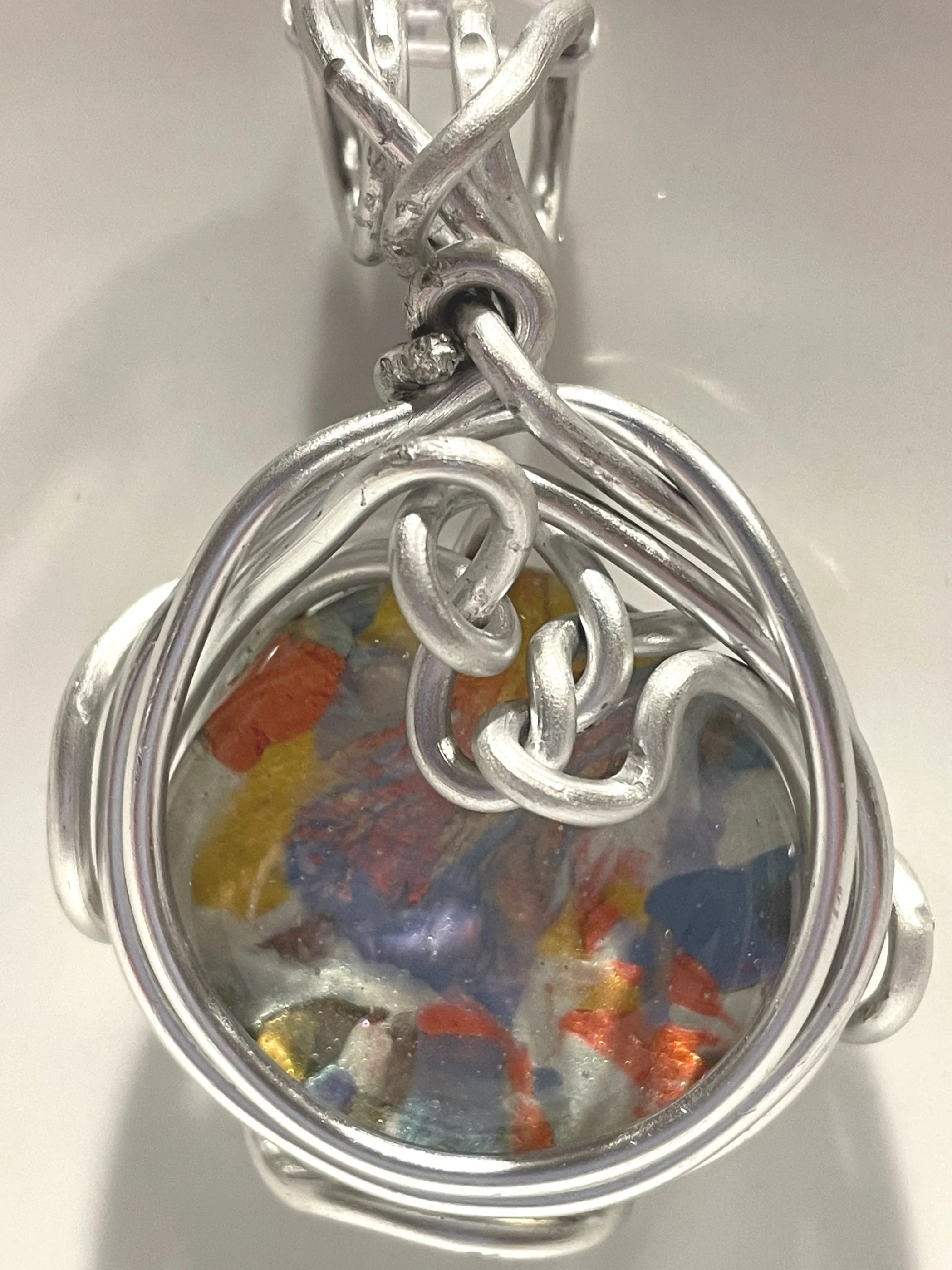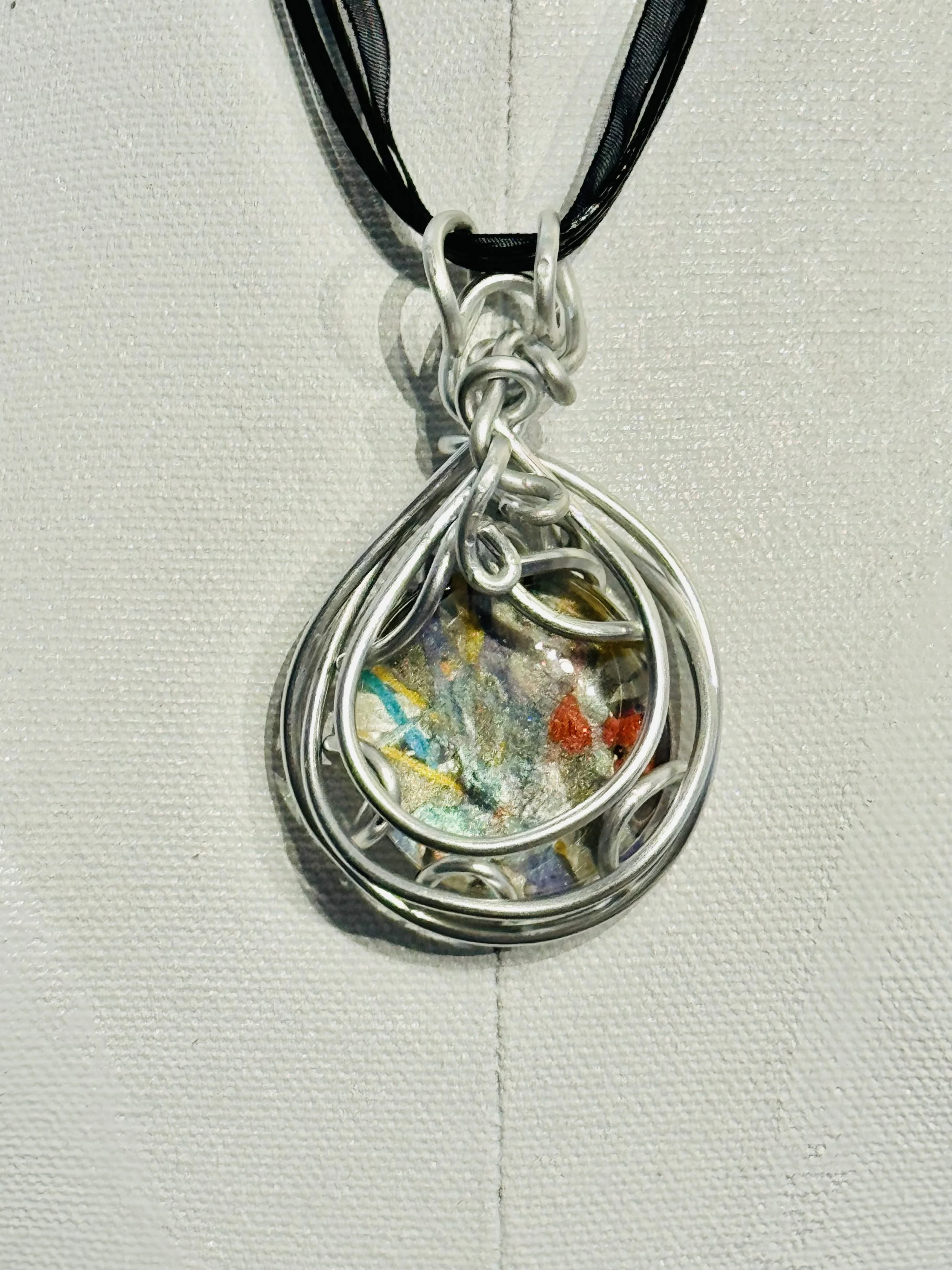 W#51: Crystal painted glass stone with aluminum craft wire. Approximate stone dimensions: 3 cm (about 1.18 in) in diameter. Includes a black 17'' layered multi-strand voile organza ribbon necklace cord or an 18” white waxed necklace string rope cord (2mm dia) with chain clasp.