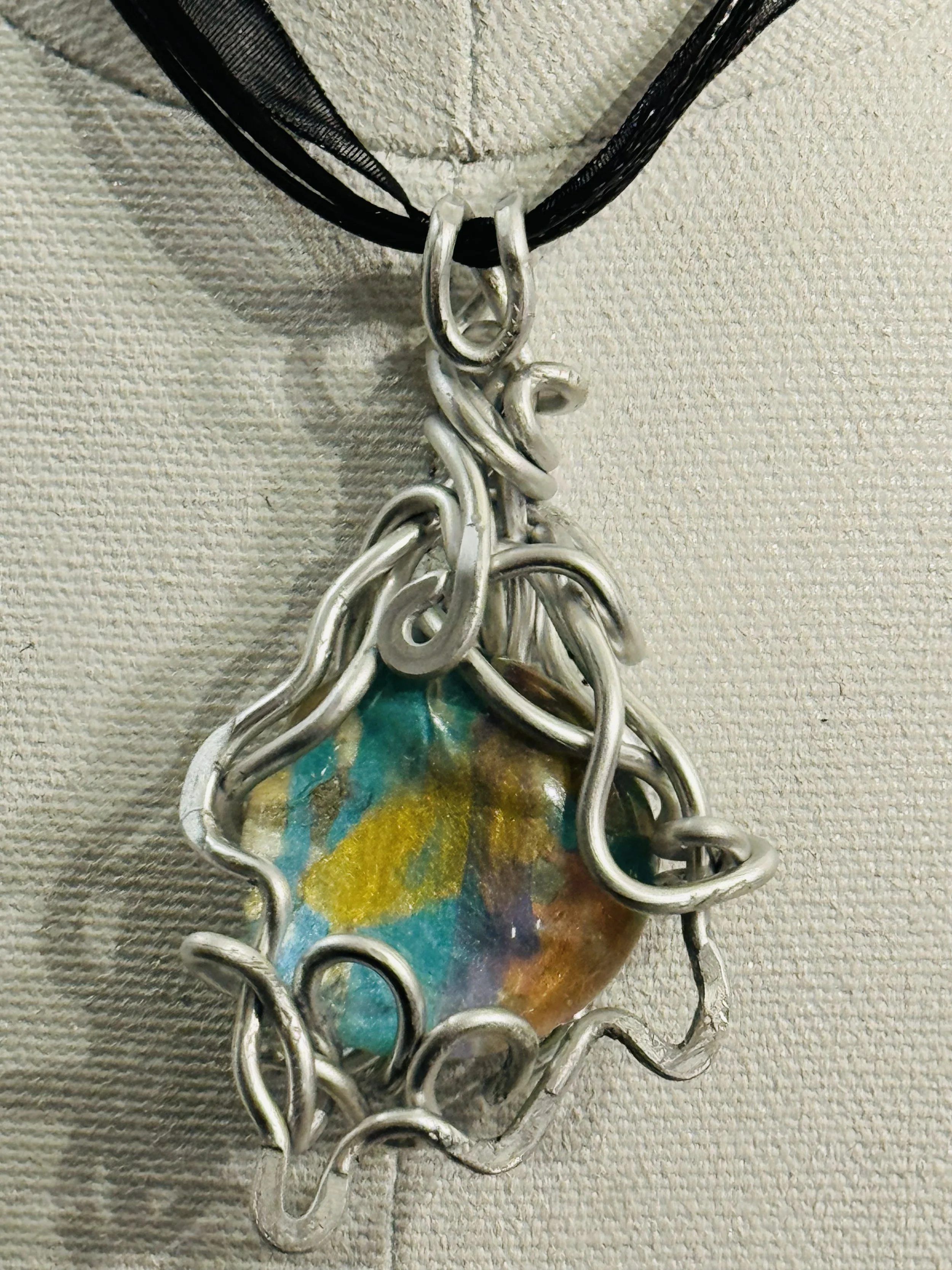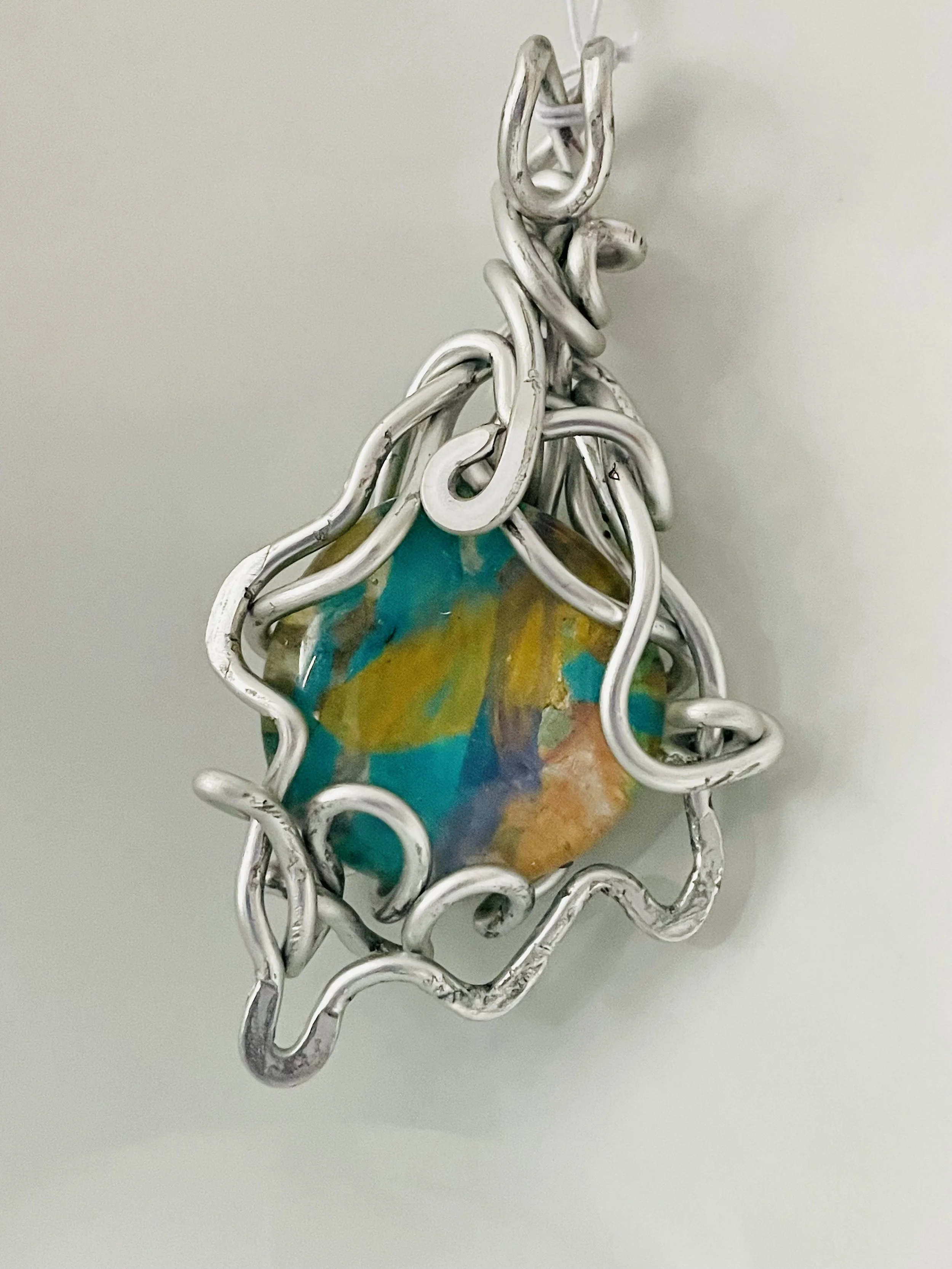 W#63 Crystal painted glass stone with aluminum craft wire. Approximate stone dimensions: 3 cm (about 1.18 in) in diameter. Includes an 18” white waxed necklace string rope cord (2mm dia) with chain clasp.