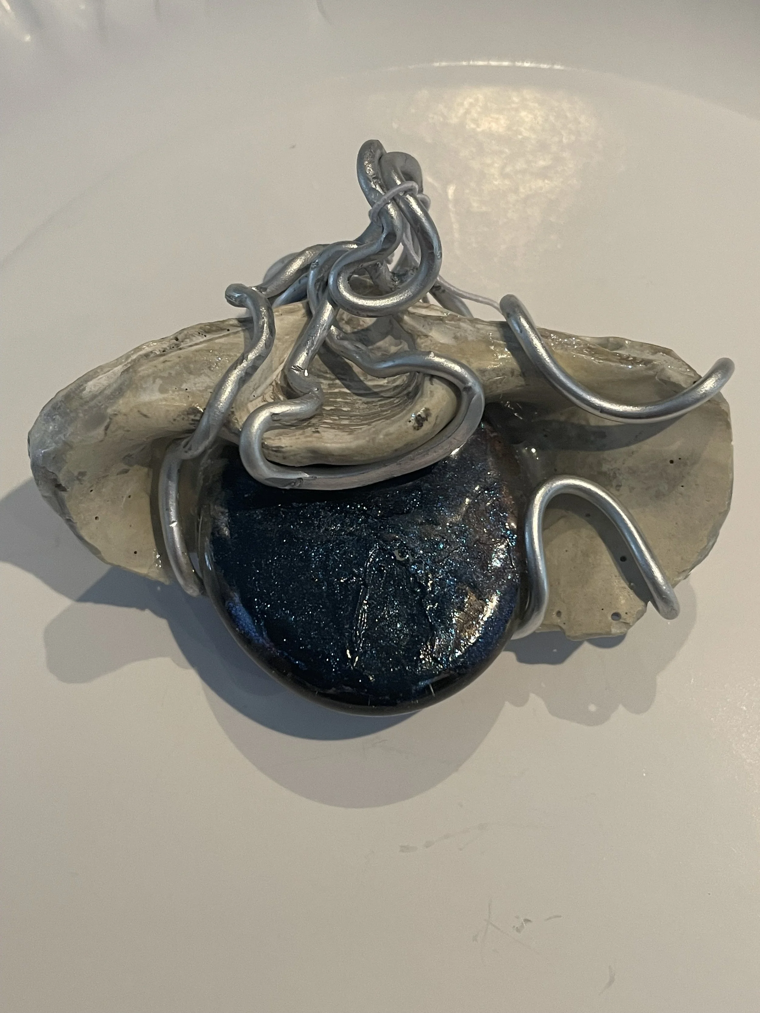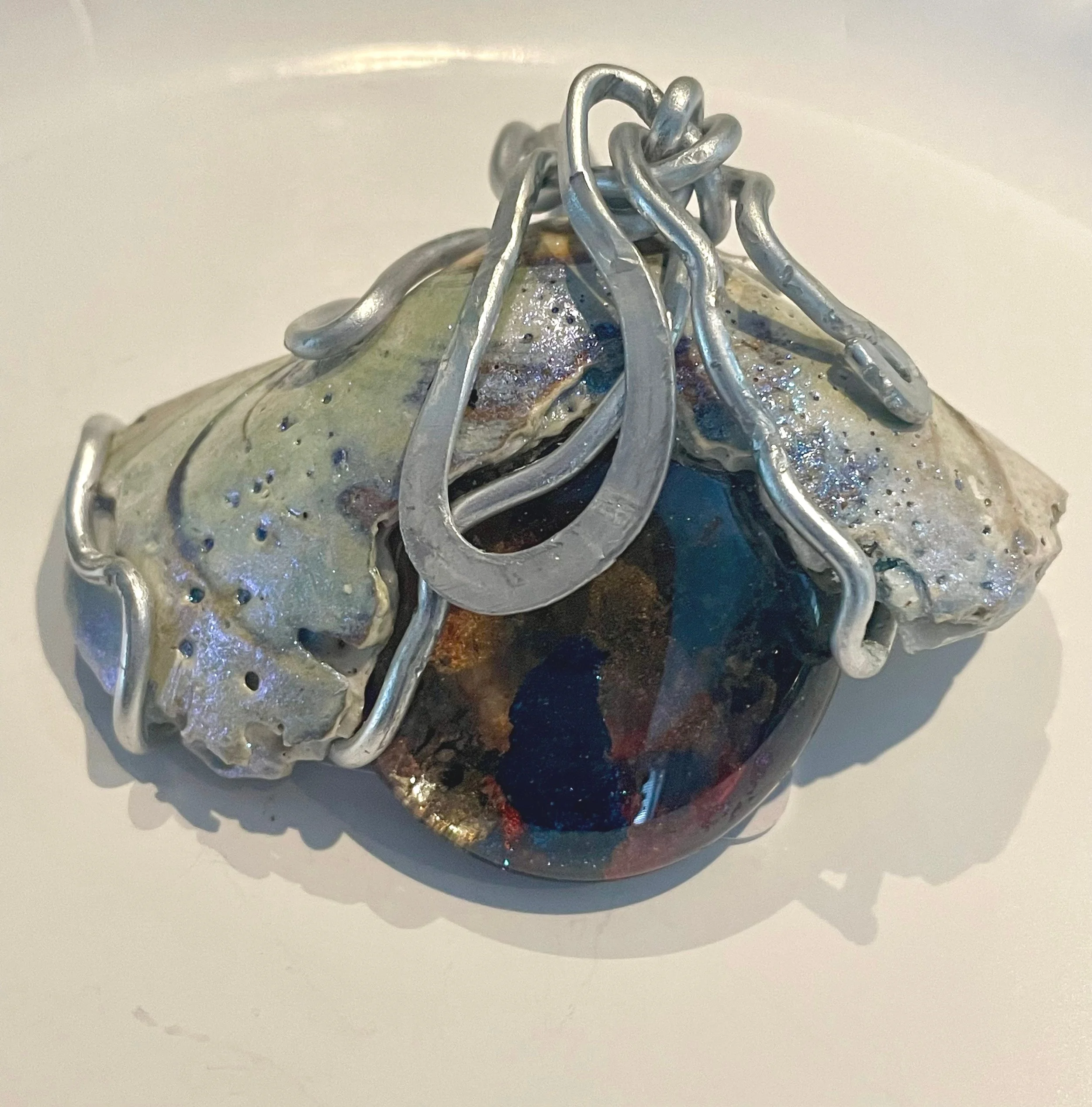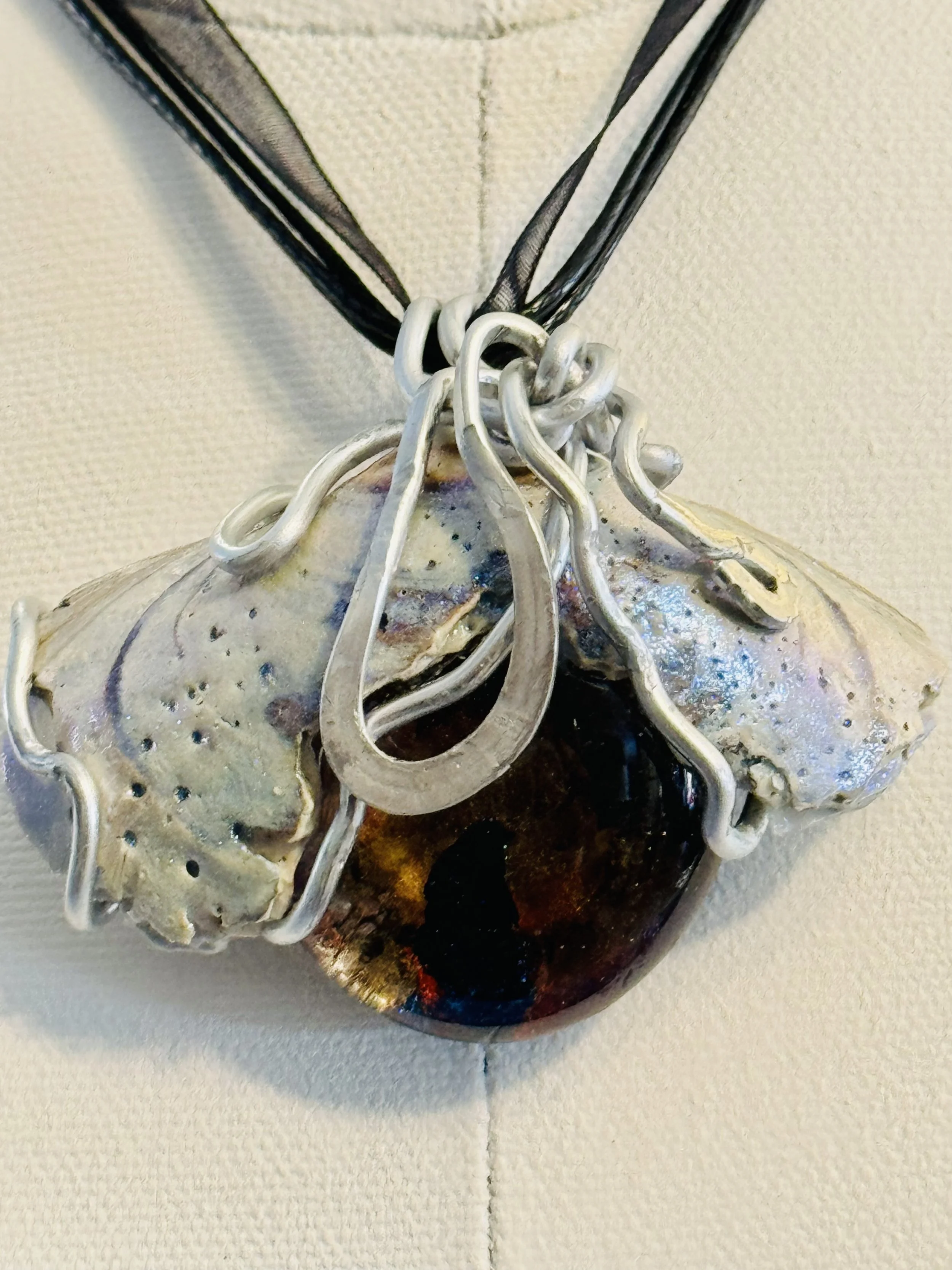 W#79: Natural seashell, crystal painted glass stone and aluminum craft wire. Includes a black 17'' layered multi-strand voile organza ribbon necklace cord or an 18” white waxed necklace string rope cord (2mm dia) with chain clasp.