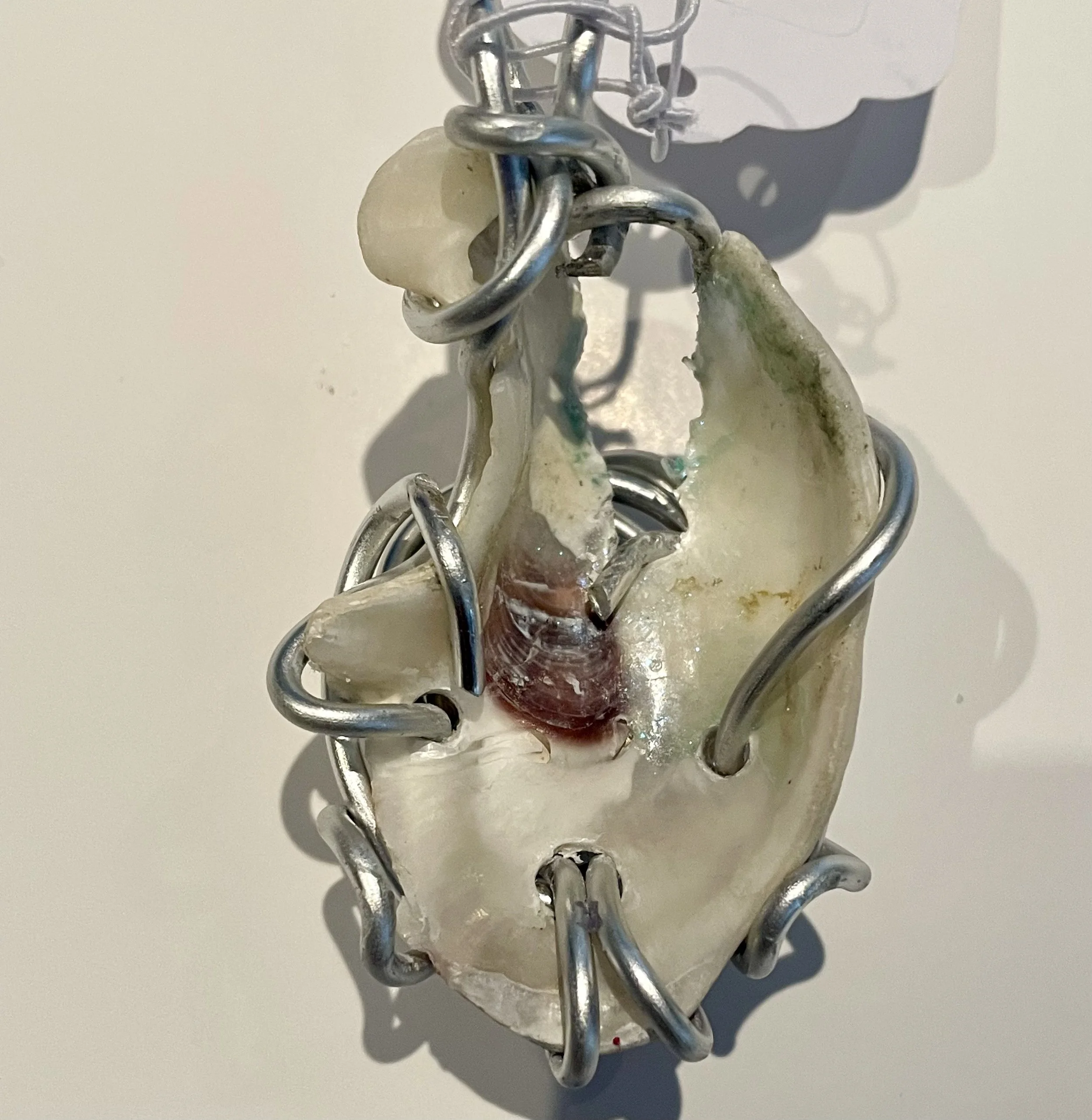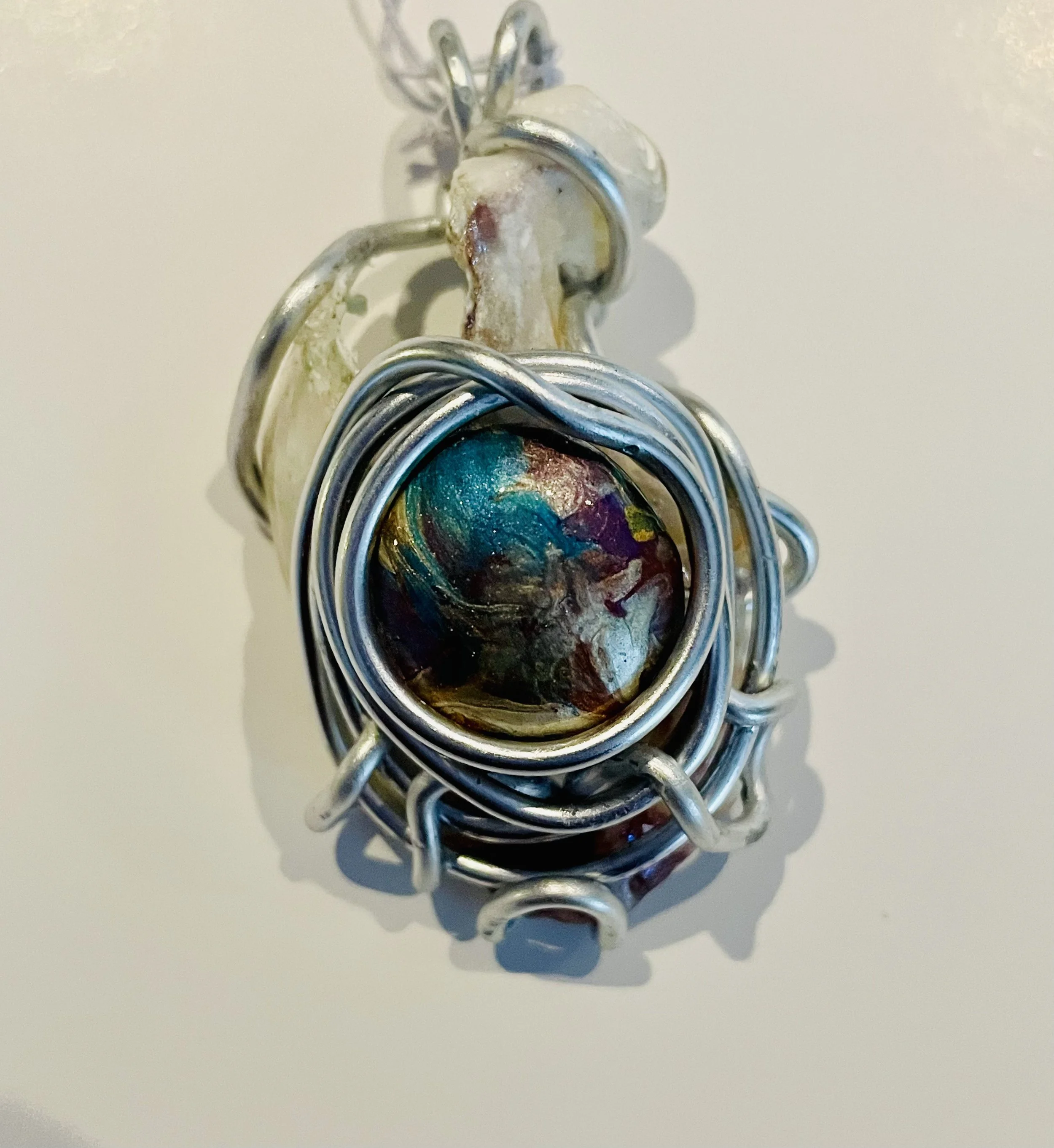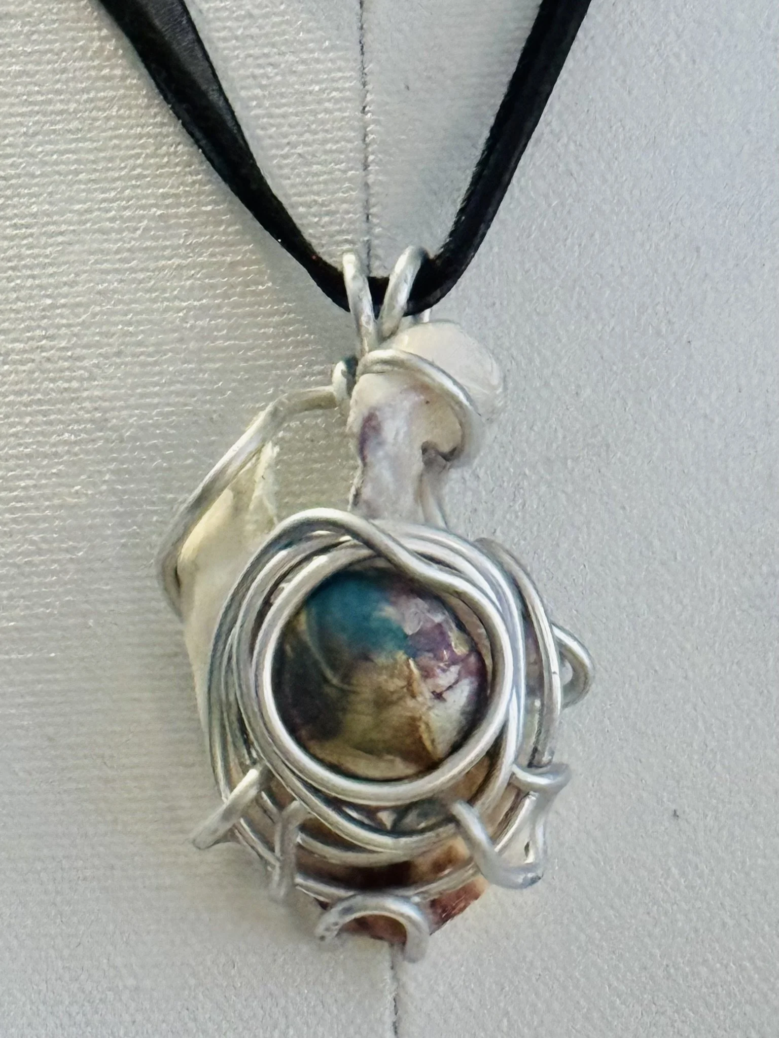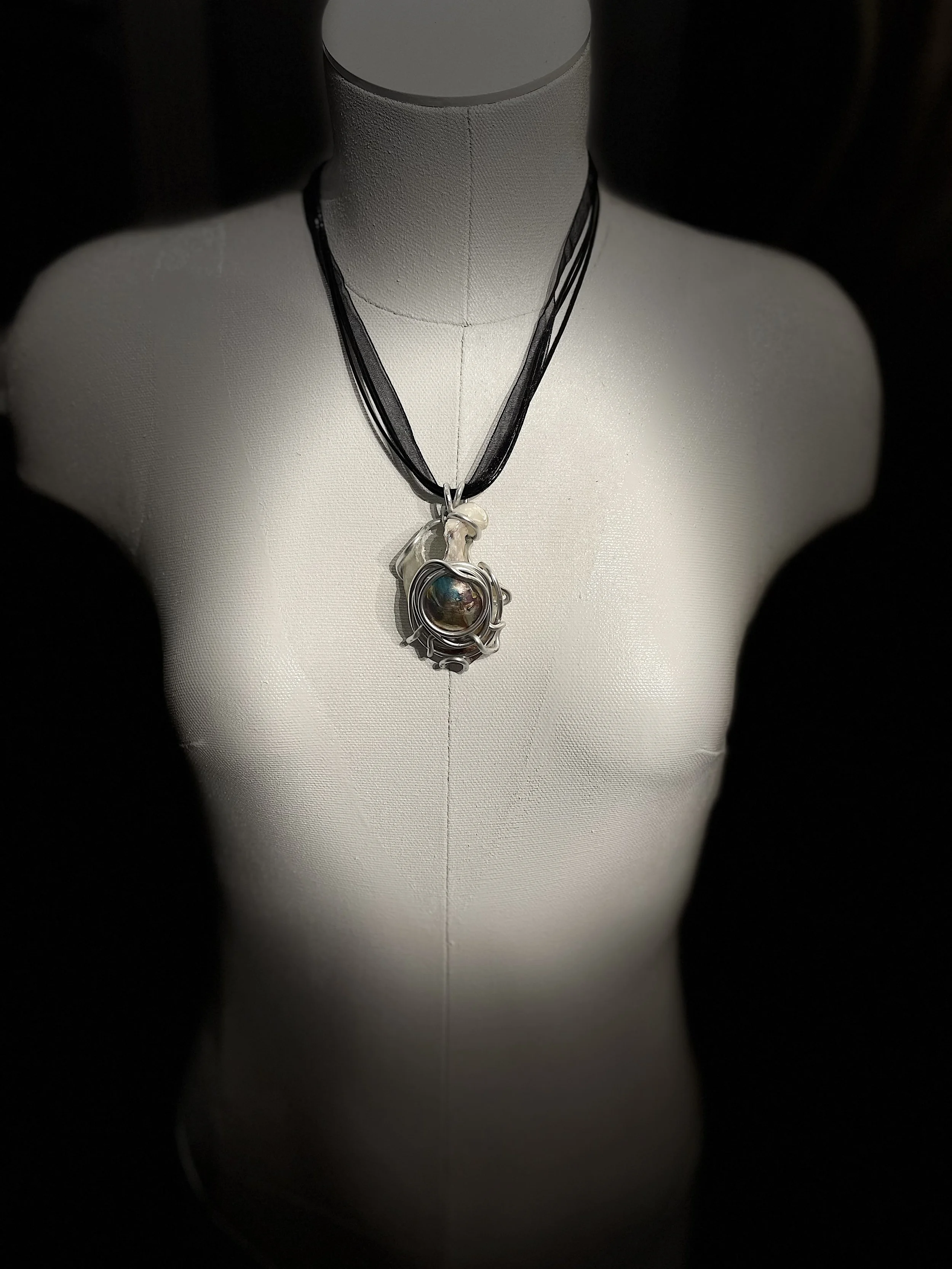 #4: Natural seashell with crystal painted glass stone and aluminum craft wire. Approximate dimensions: 4 cm (about 1.38 in) W x 6 cm (about 2.36 in) L; glass stone 3 cm (about 1.18 in) in diameter. Includes a black 17'' layered multi-strand voile organza ribbon necklace cord