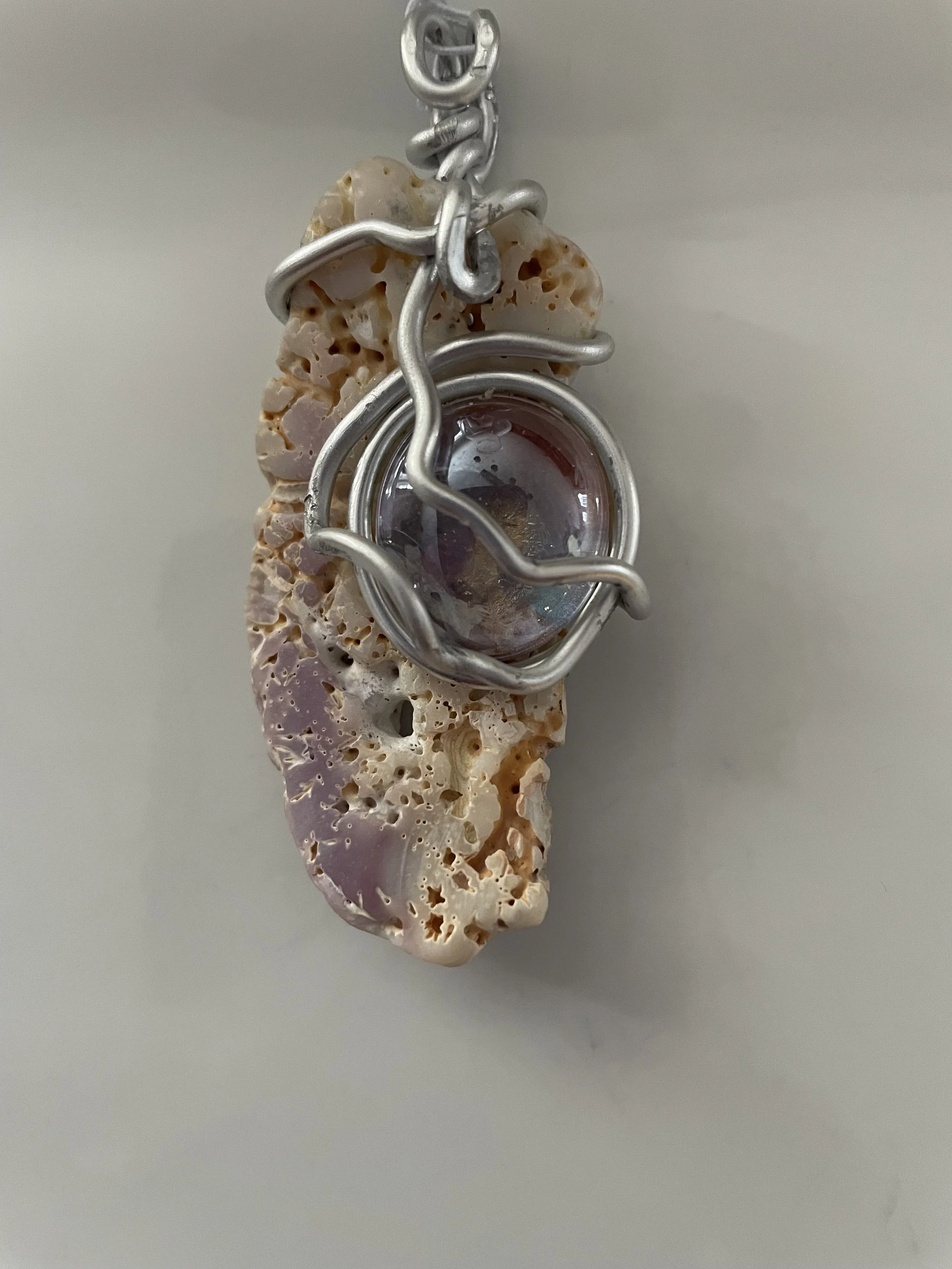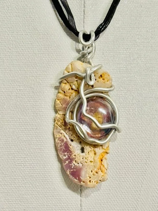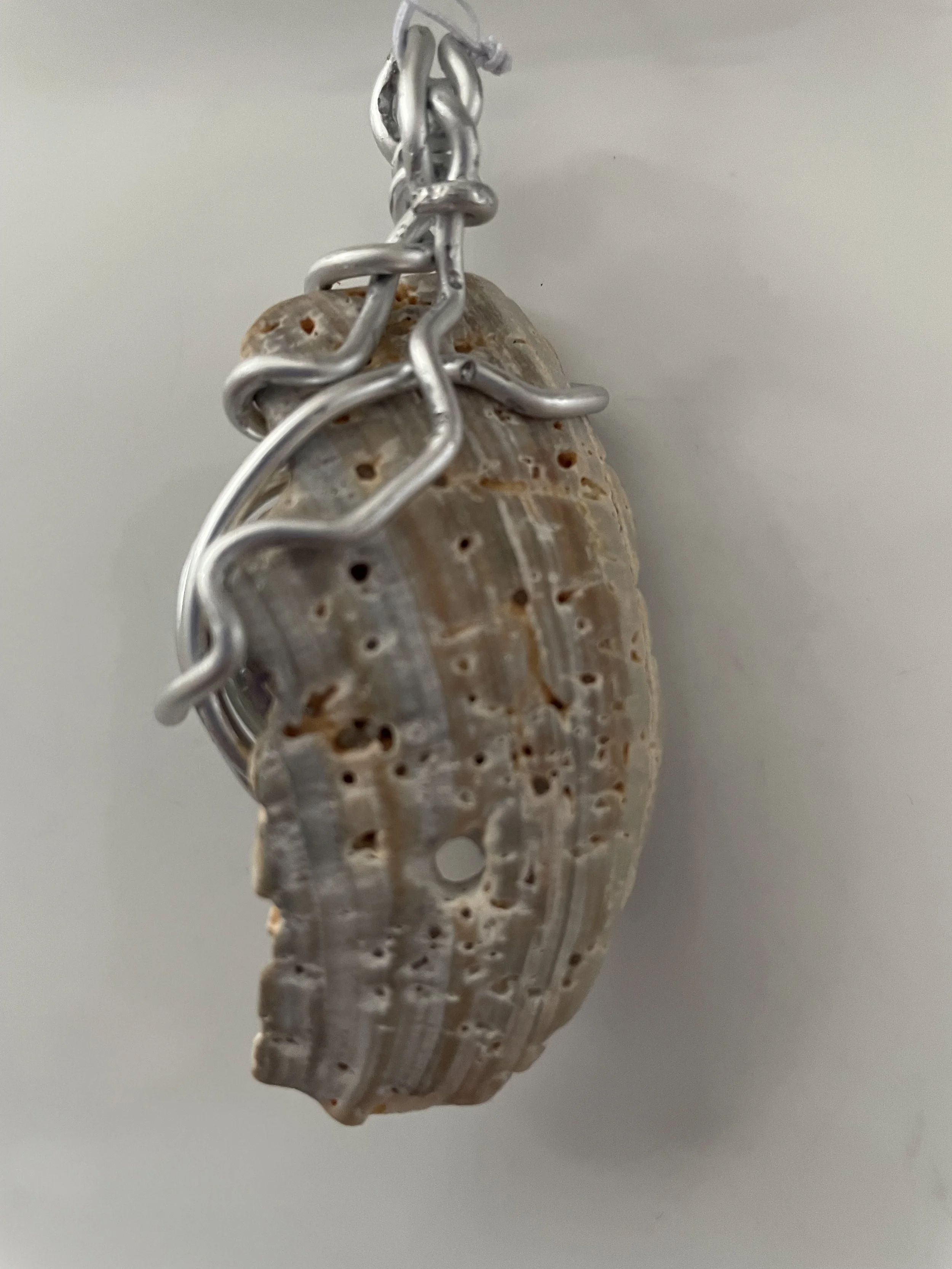 W#20: Natural seashell, crystal painted glass stone and aluminum craft wire. Includes a black 17'' layered multi-strand voile organza ribbon necklace cord or an 18” white waxed necklace string rope cord (2mm dia) with chain clasp.