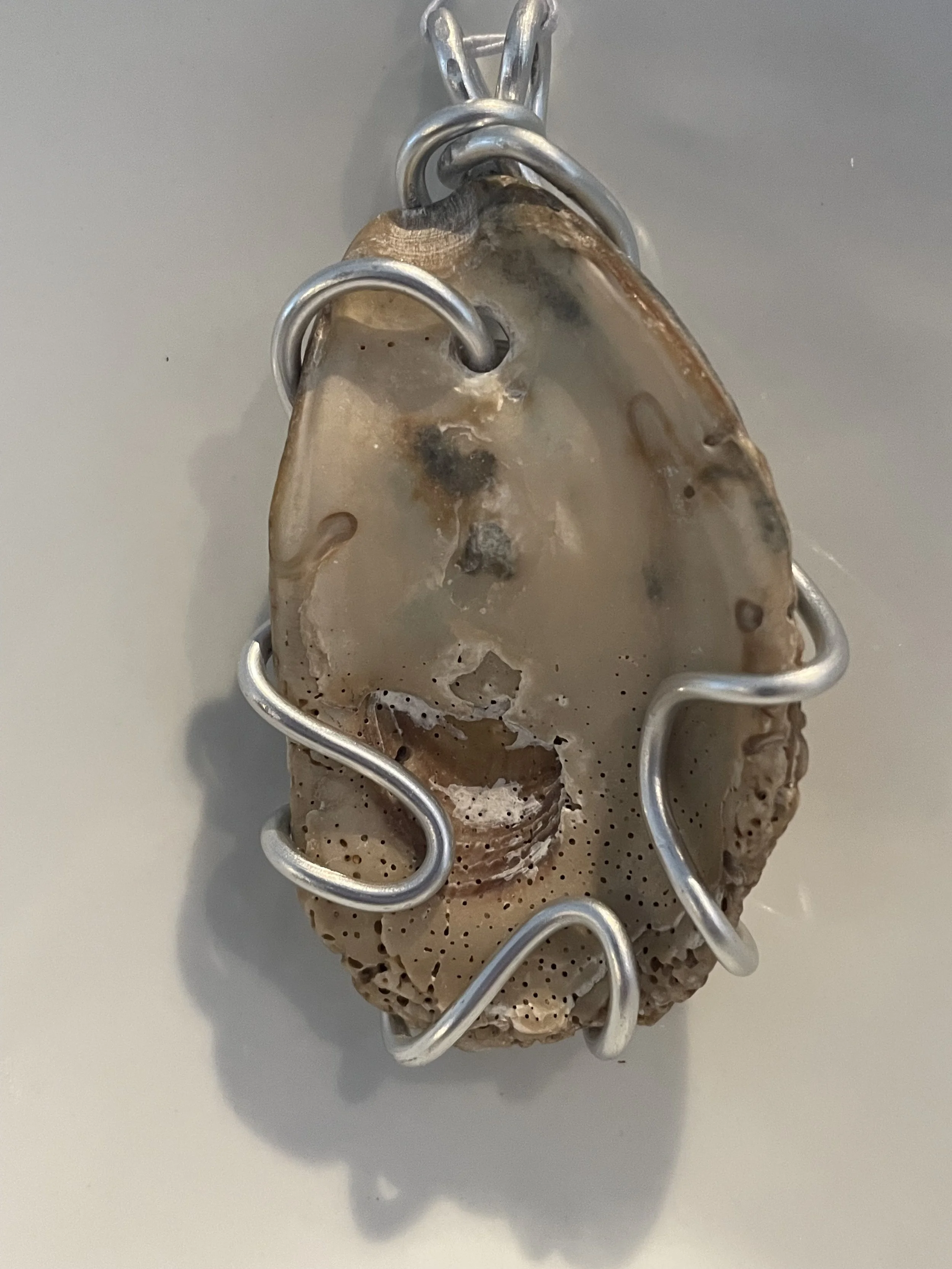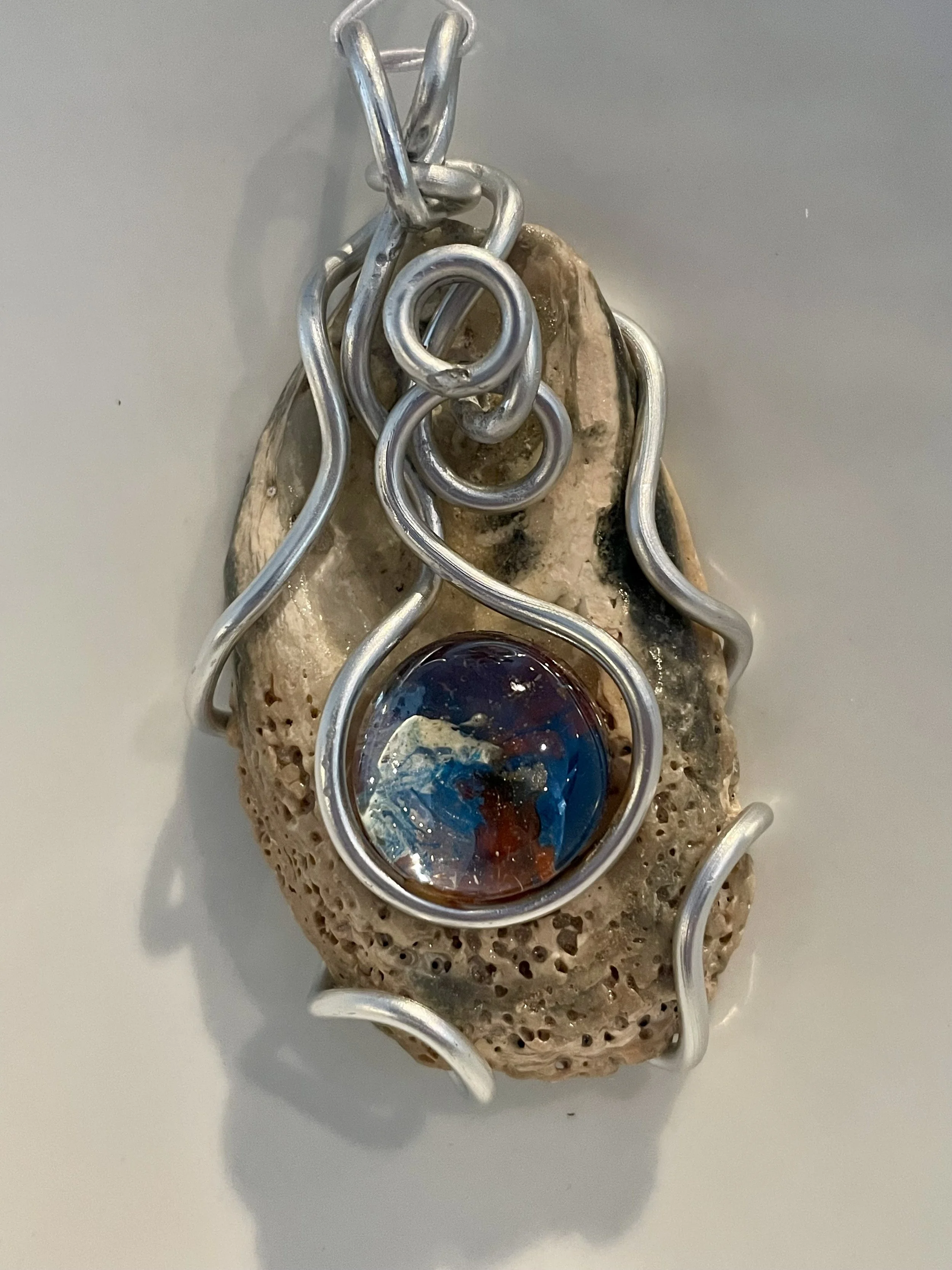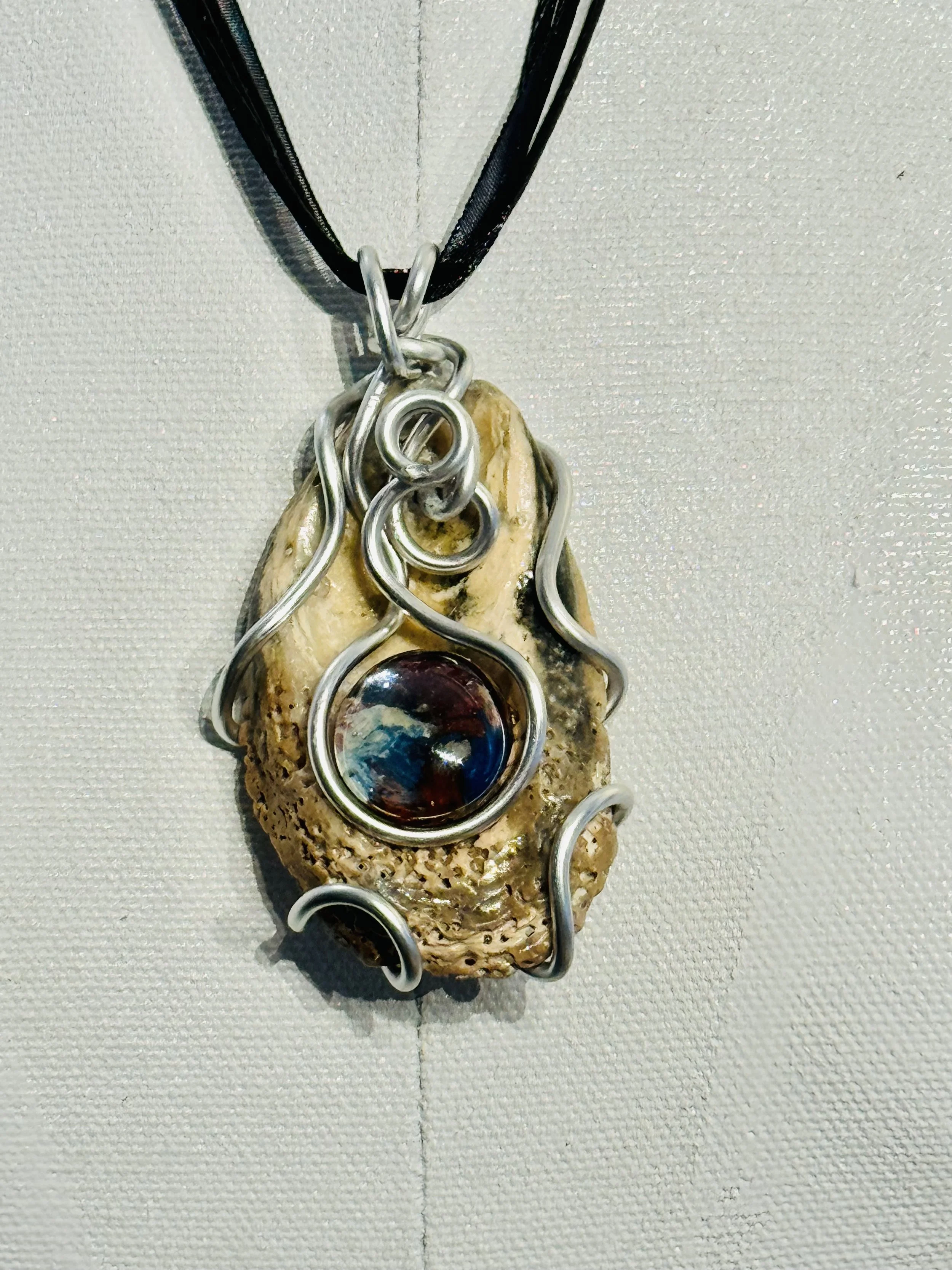 W#23: Natural seashell, crystal painted glass stone and aluminum craft wire. Approximate dimensions: 4 cm (about 1.57 in) W x 7 cm (about 2.76 in) L; glass stone 3 cm (about 1.18 in) in diameter. Includes a black 17'' layered multi-strand voile organza ribbon necklace cord