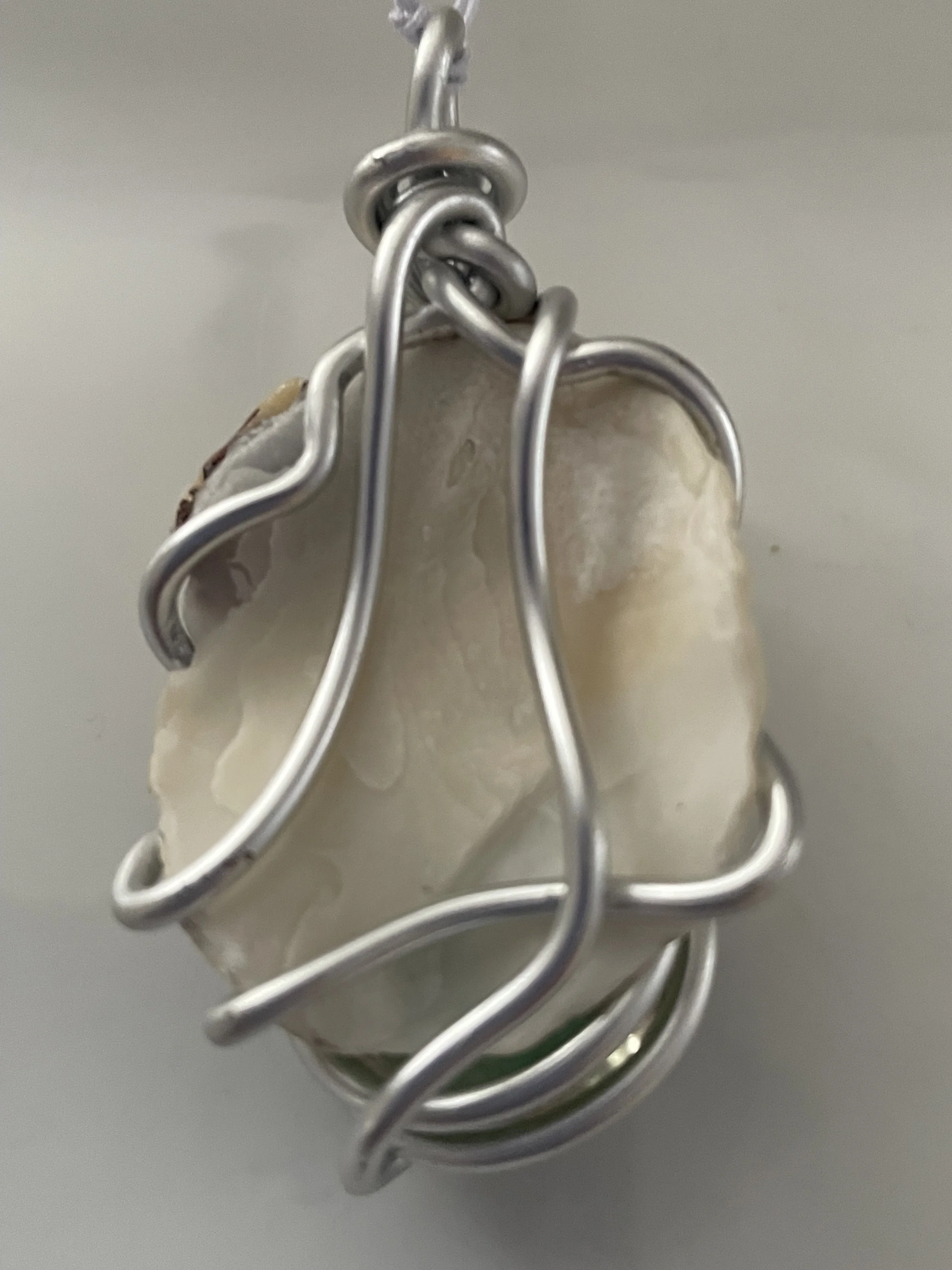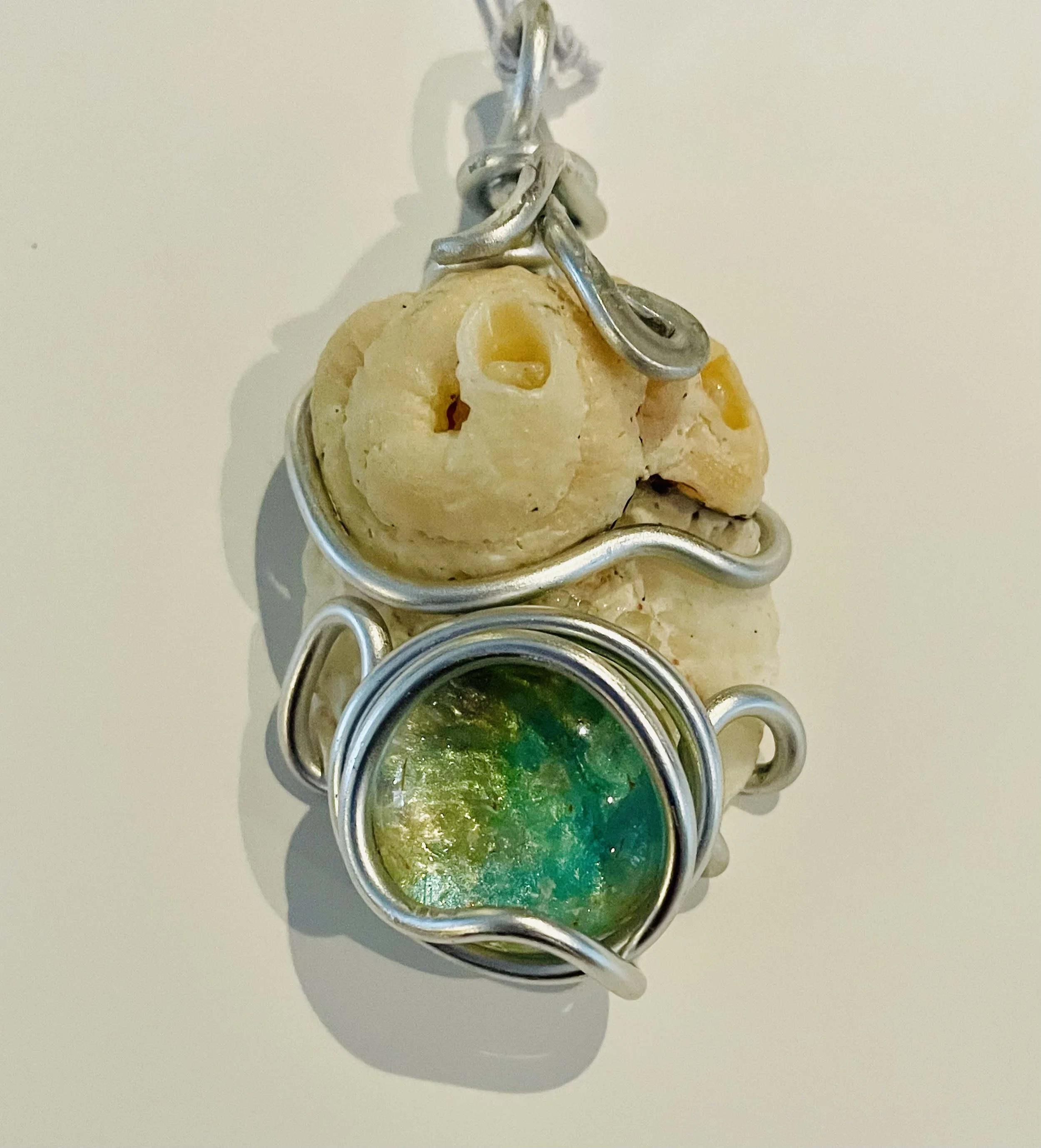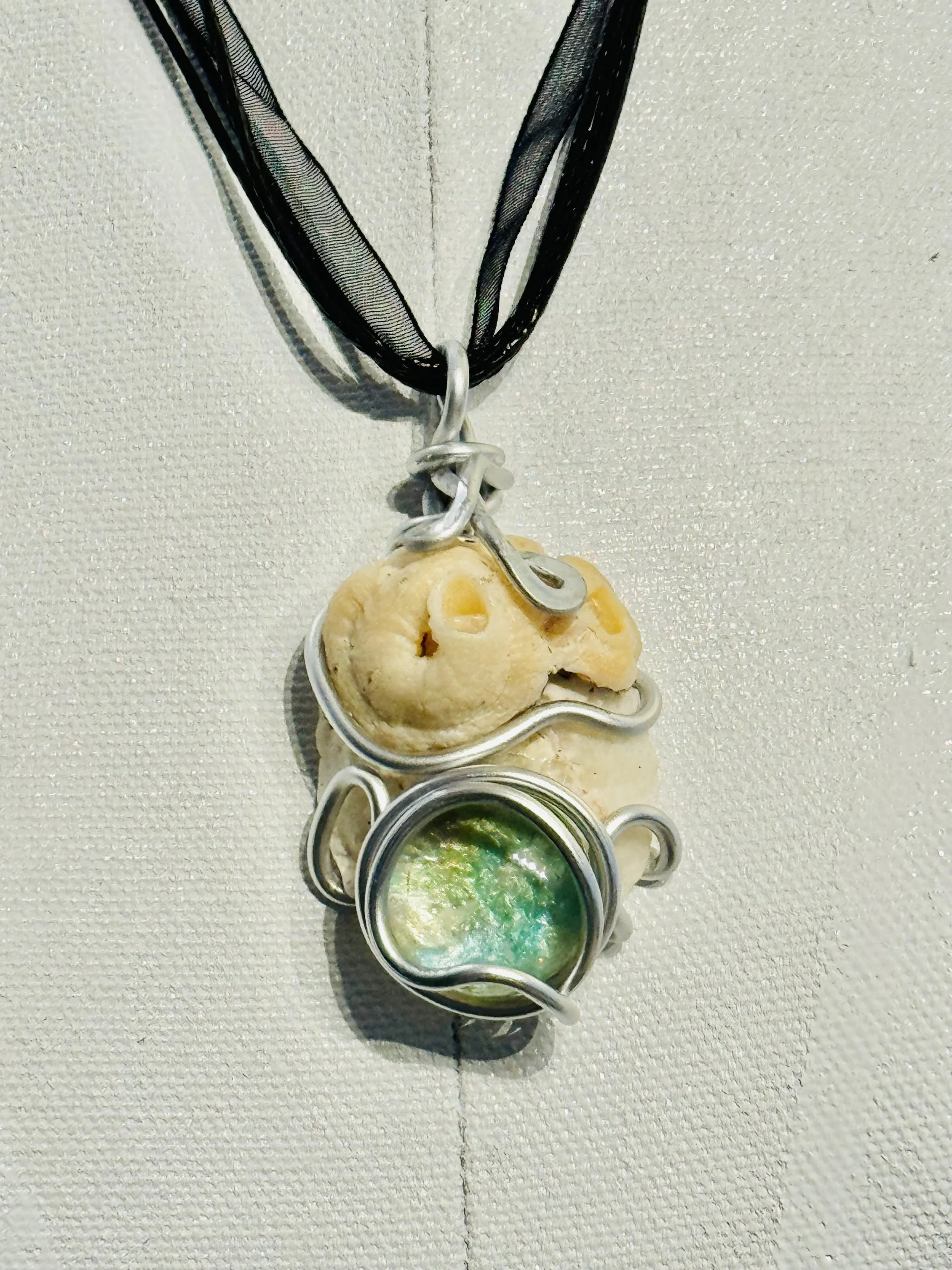 Upon close inspection you’ll find a baby’s face within the shell adding a unique and whimsical element to this pendant adorned with a radiant glass stone with hues of greens and yellows