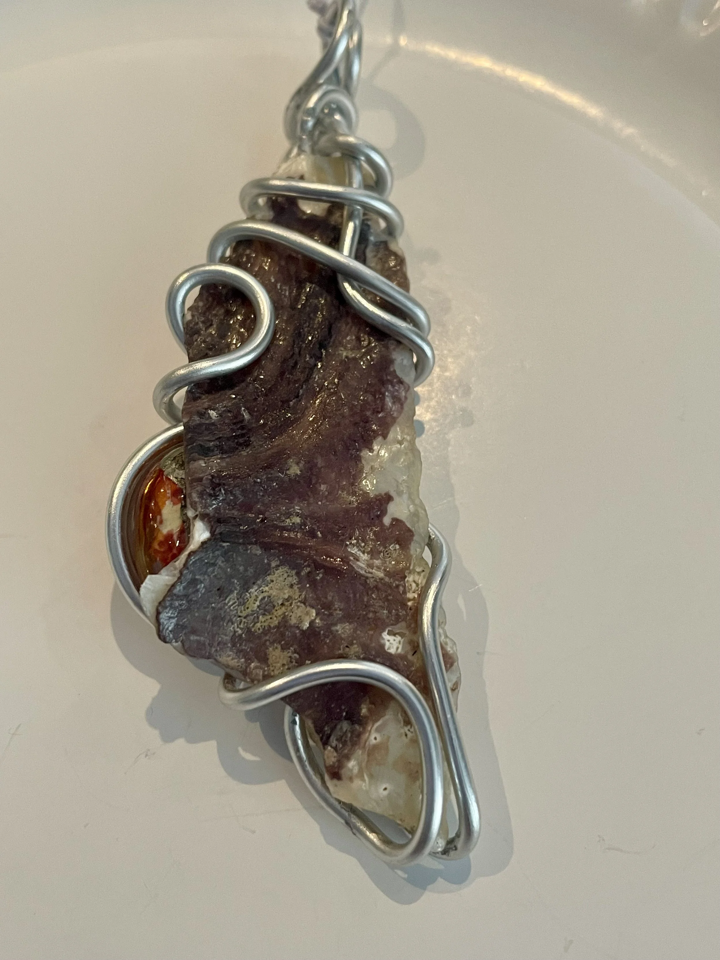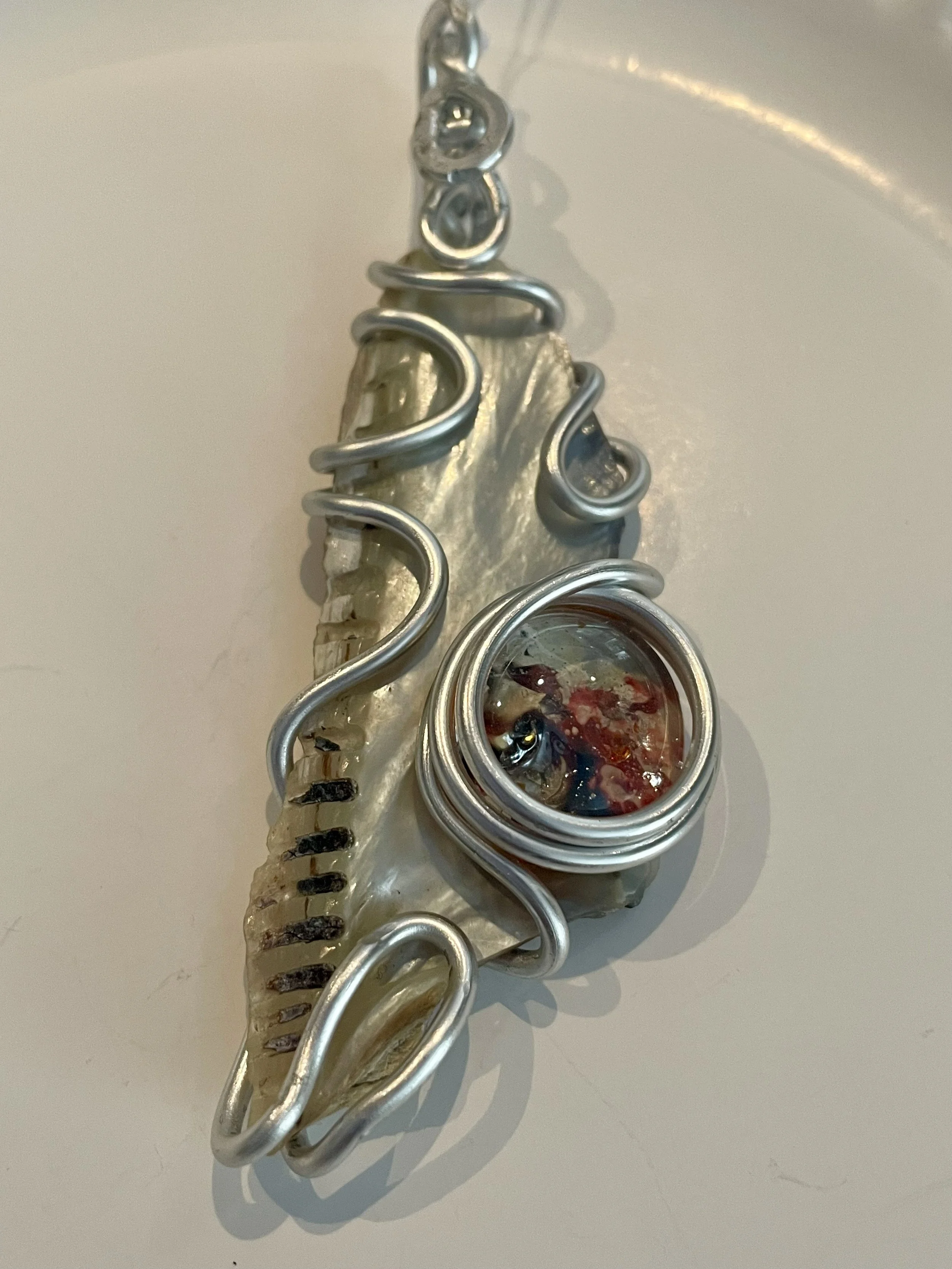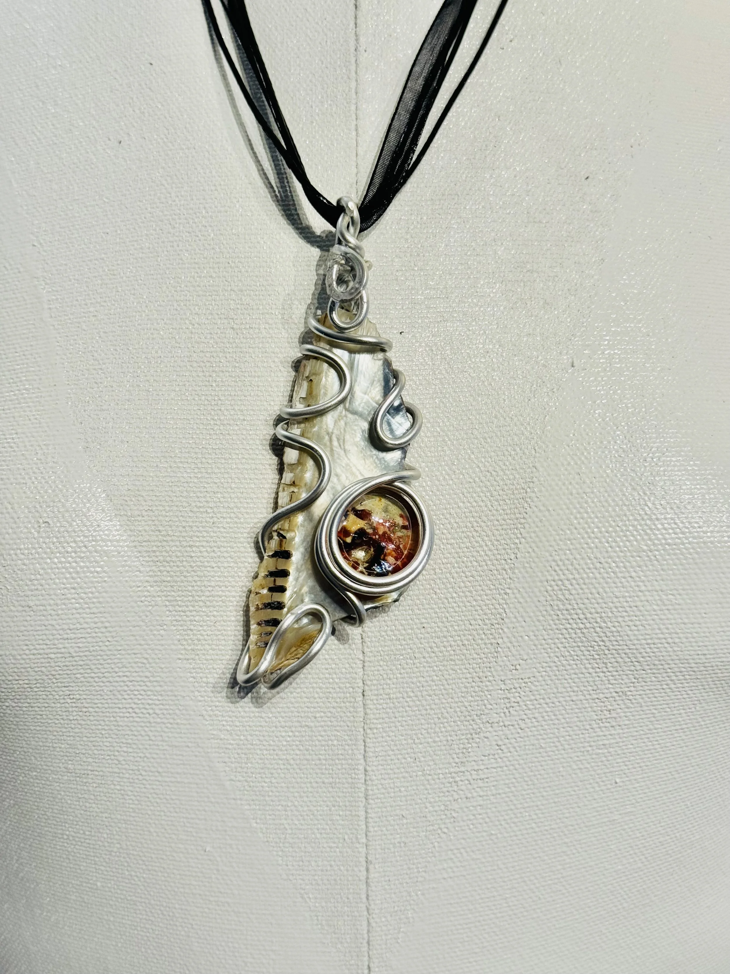 W#32: Natural seashell, crystal painted glass stone and aluminum craft wire. Includes a black 17'' layered multi-strand voile organza ribbon necklace cord or an 18” white waxed necklace string rope cord (2mm dia) with chain clasp.