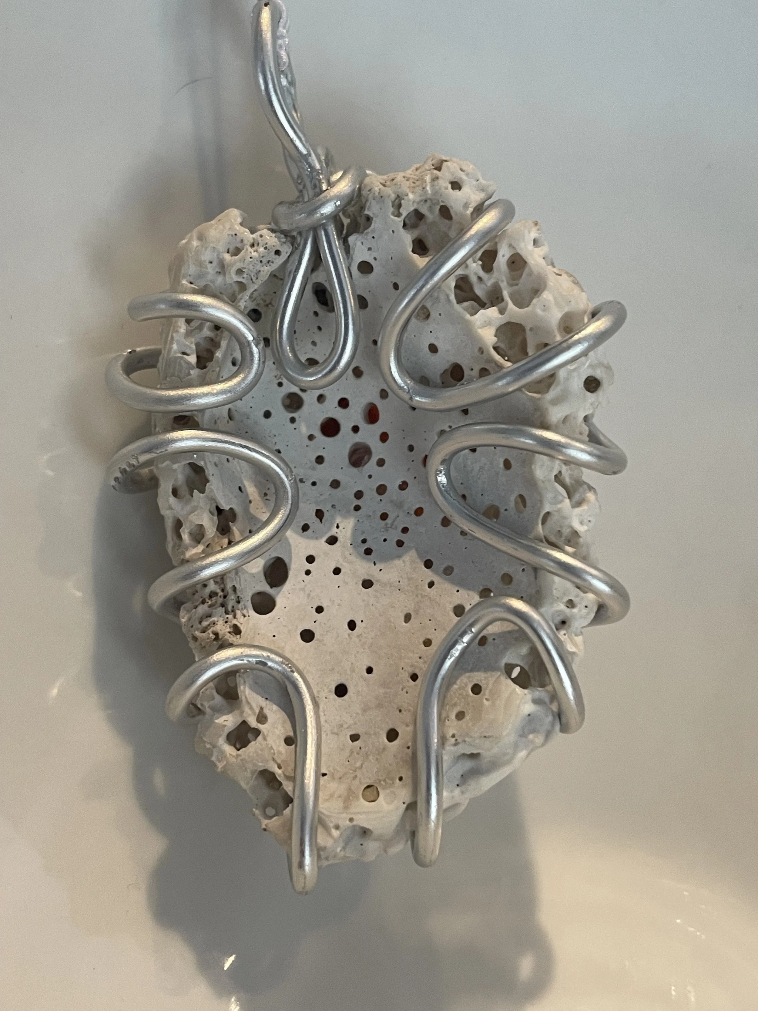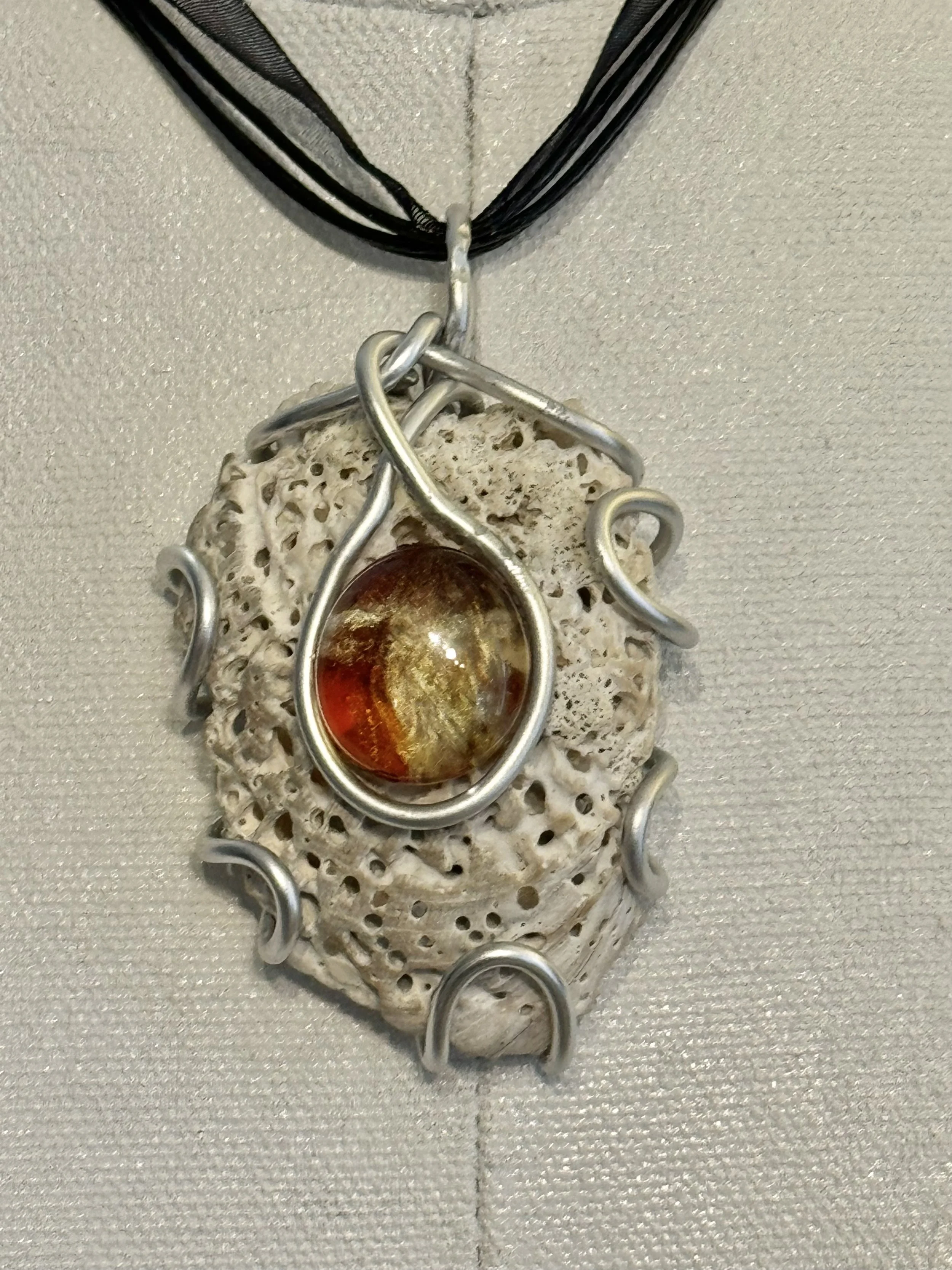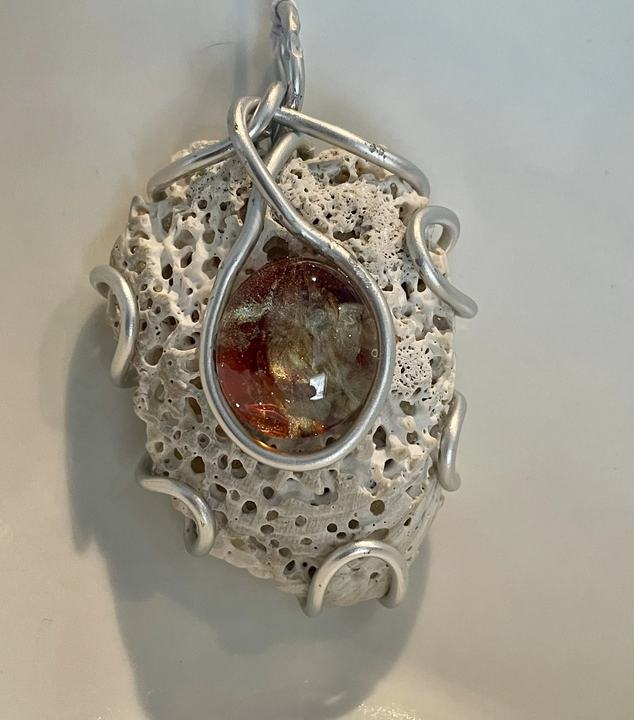 A central, amber-colored glass stone set within a swirling wire design set upon a porous shell resembling coral. A combination of effects that add an image of waves and a touch of natural elegance.