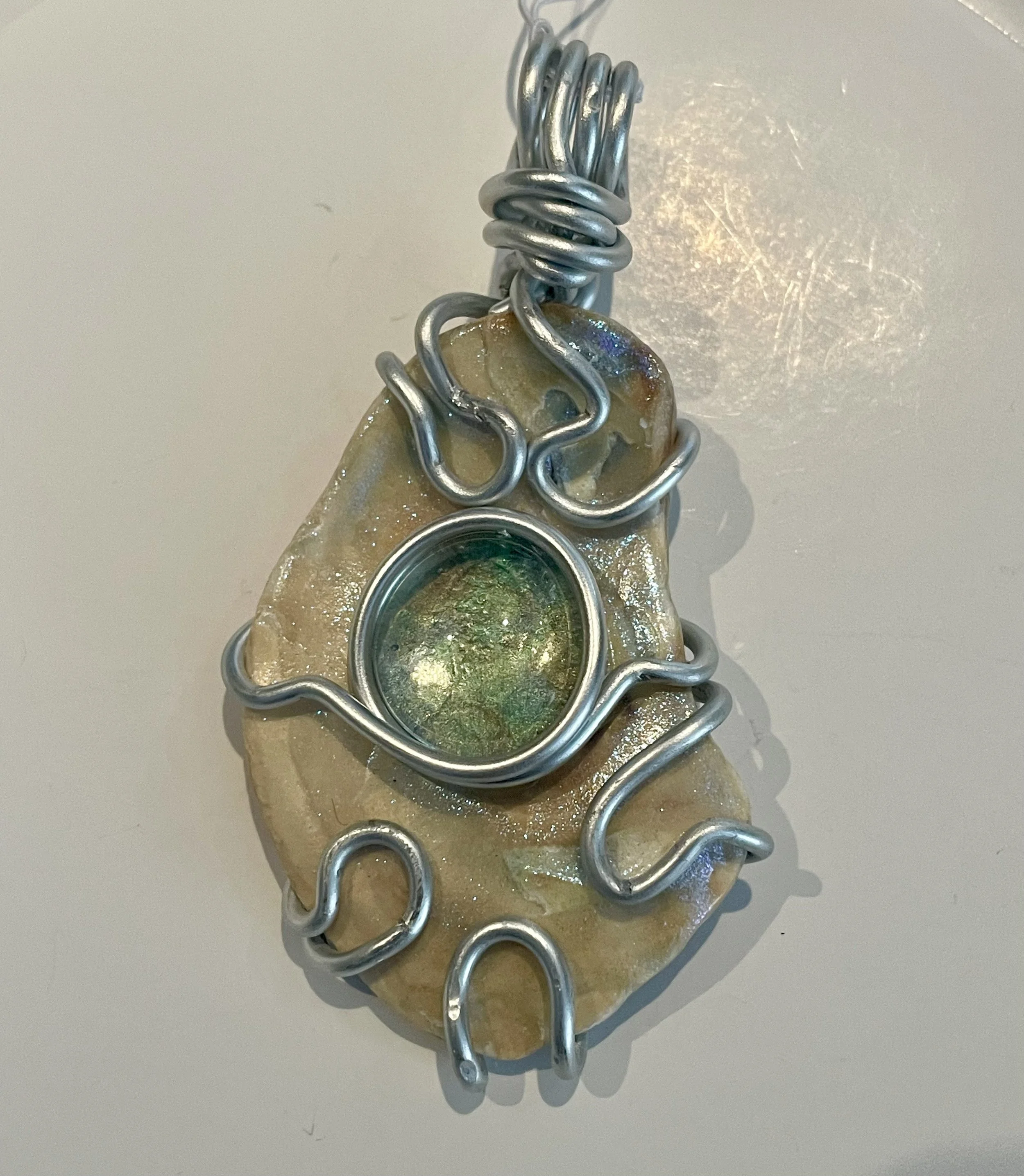 The shell’s opaque beige color is subtly translucent and embraces a mystically iridescent green glass stone! The perfect accessory for those seeking a touch of magic in their everyday lives.