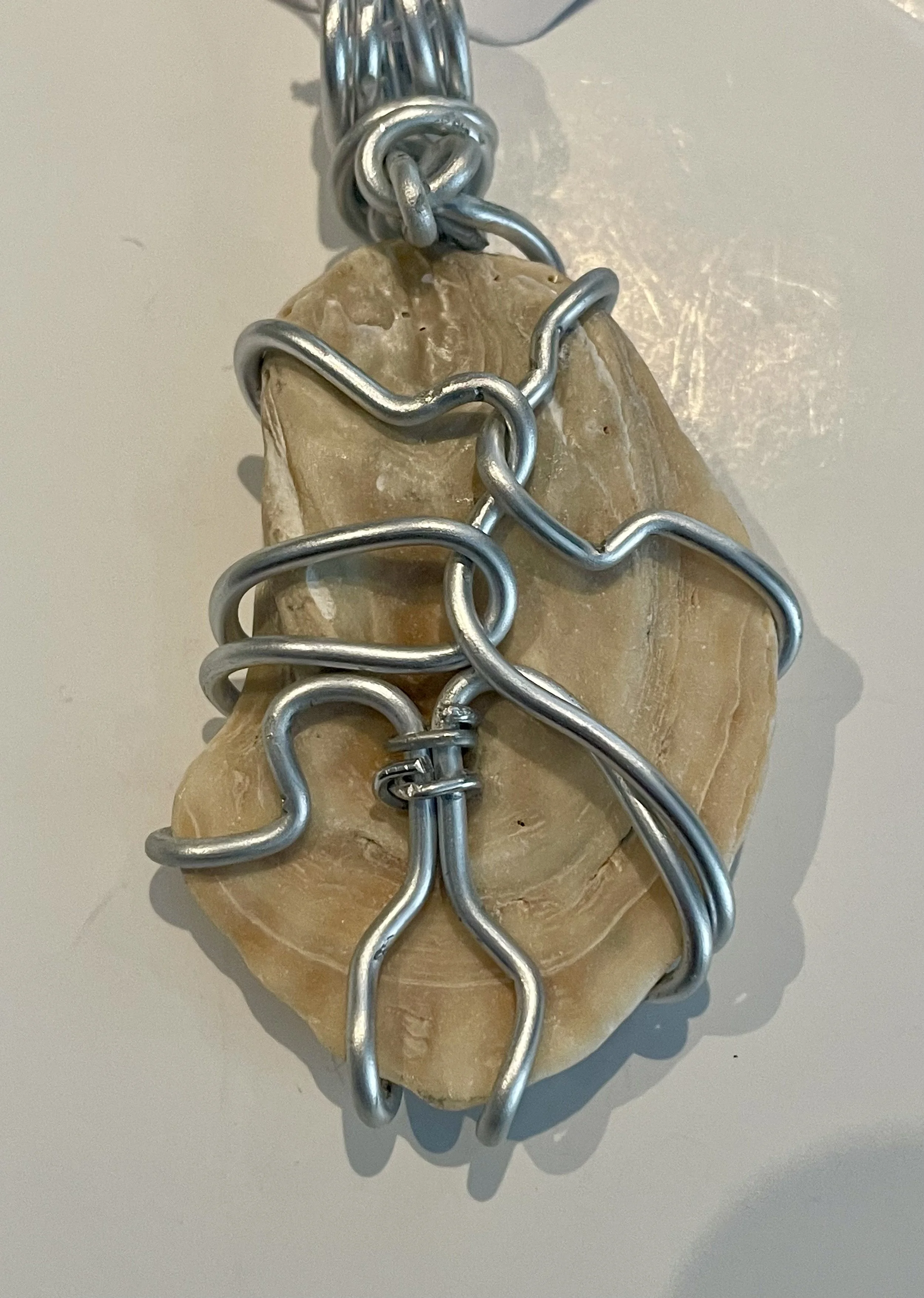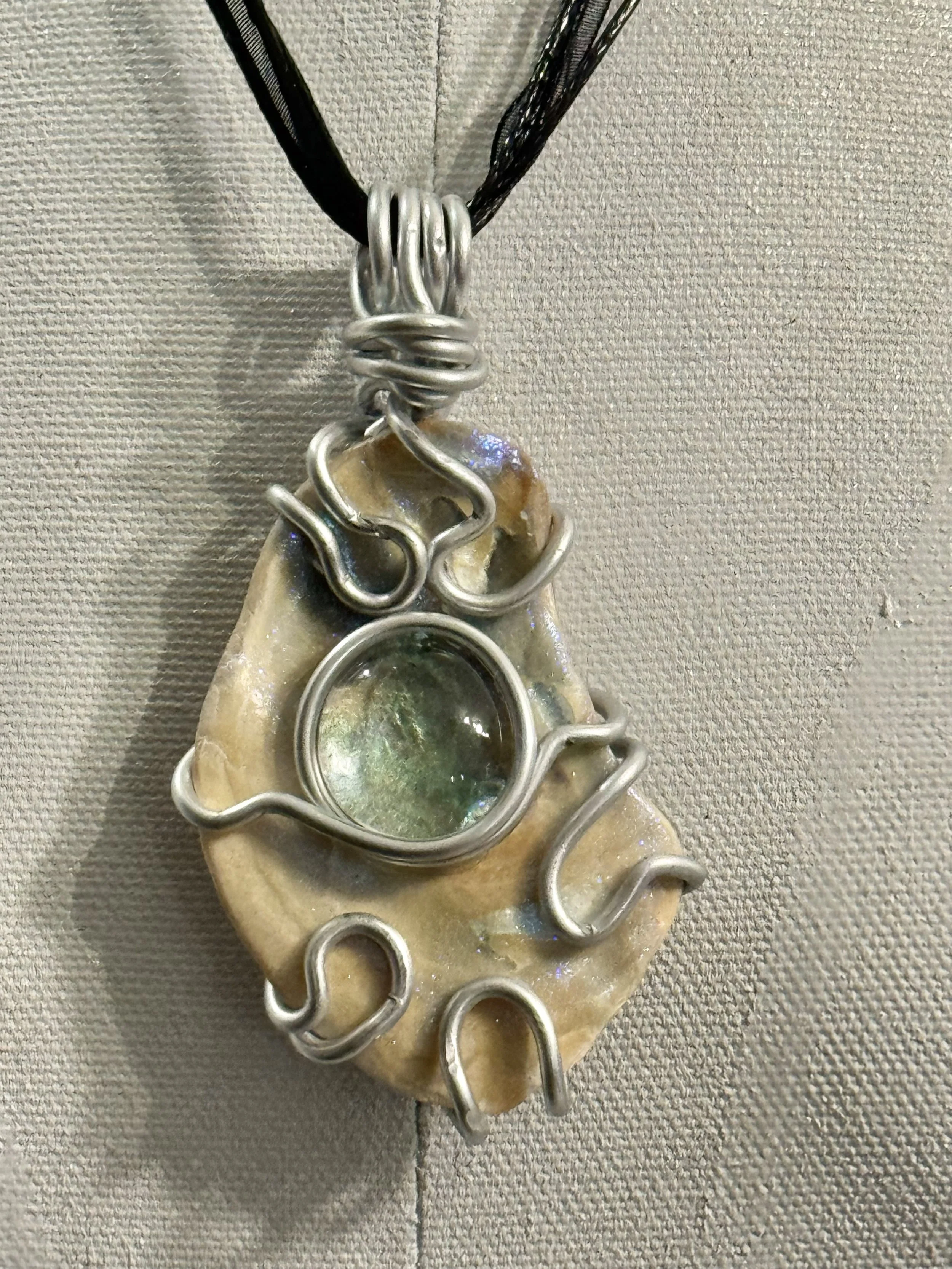 W#42: Natural seashell, crystal painted glass stone and aluminum craft wire. Includes a black 17'' layered multi-strand voile organza ribbon necklace cord or an 18” white waxed necklace string rope cord (2mm dia) with chain clasp.