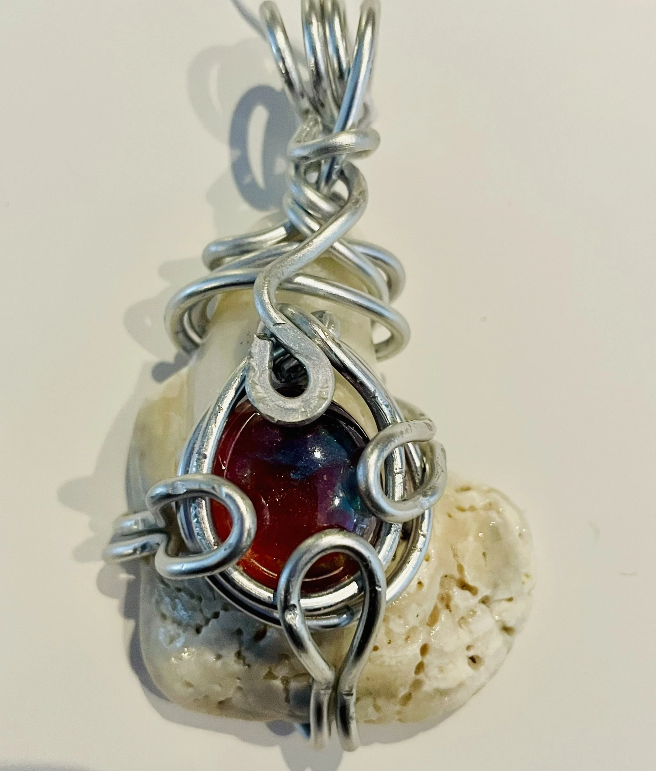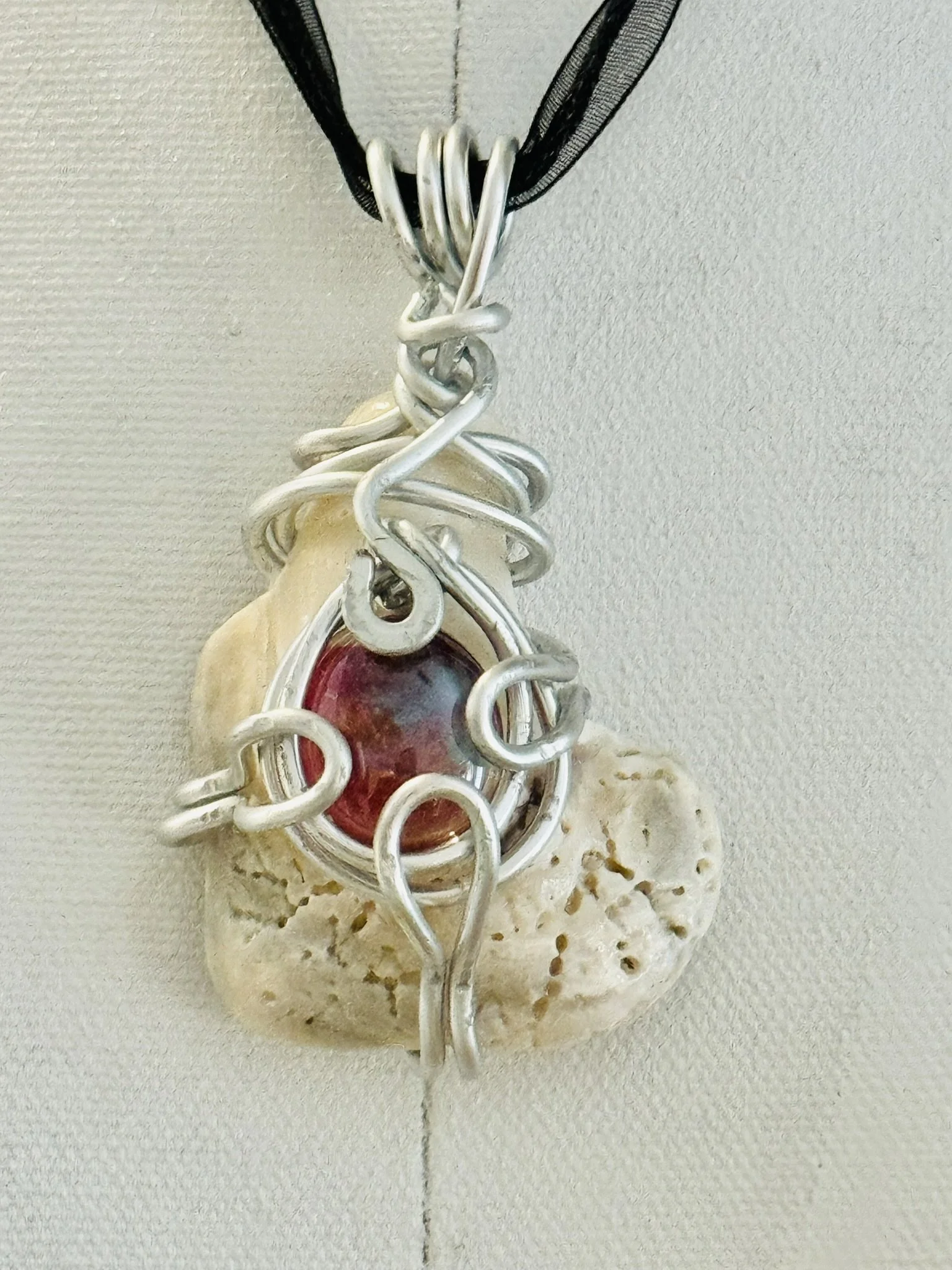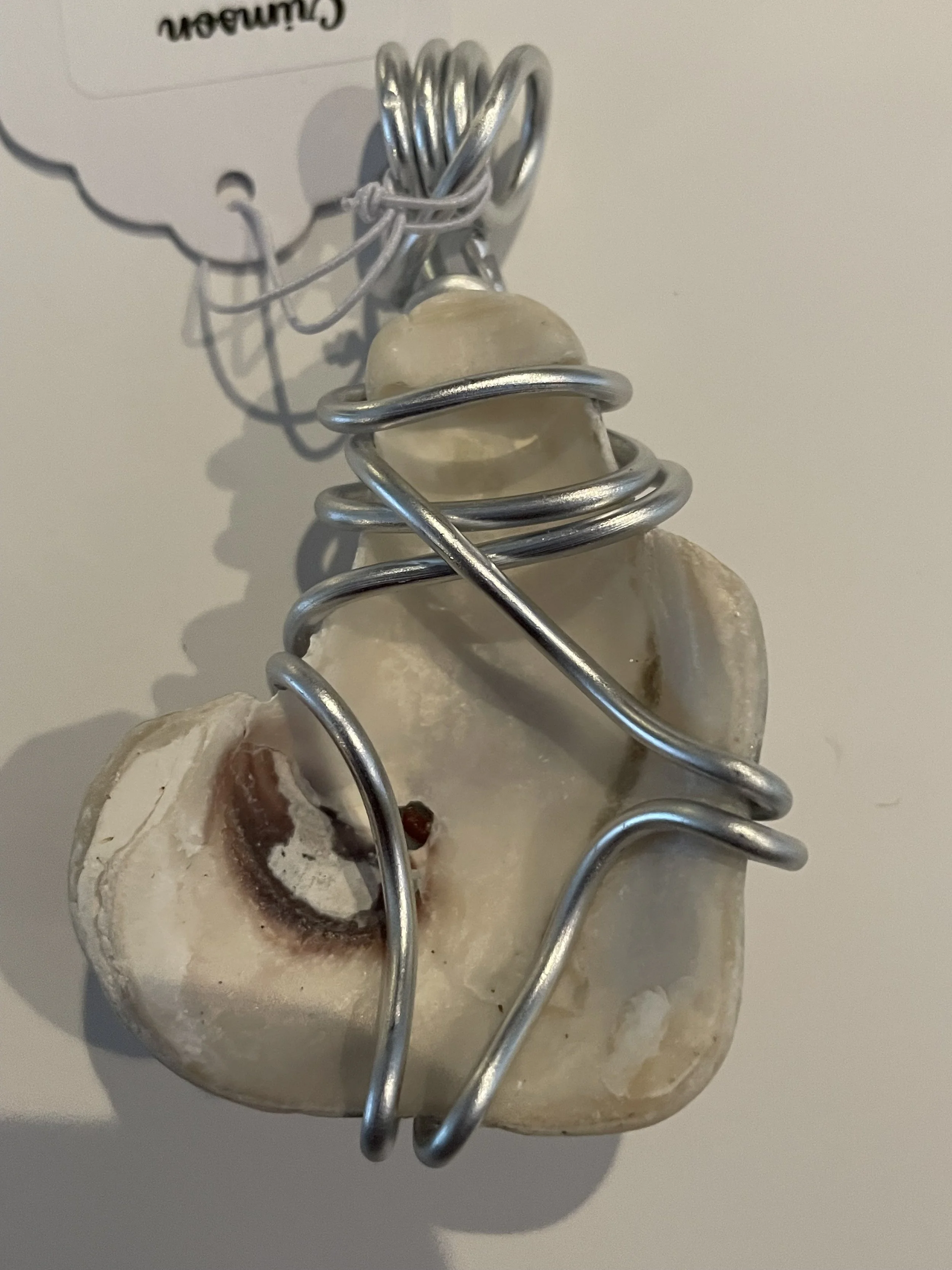 W#3: Natural seashell, crystal painted glass stone and aluminum craft wire Approximate dimensions: 4 cm (about 1.57 in) W x 7.5 cm (about 2.95 in) L; glass stone 1.5 cm (about 0.59 in) in diameter. Includes a black 17'' layered multi-strand voile organza ribbon necklace cord